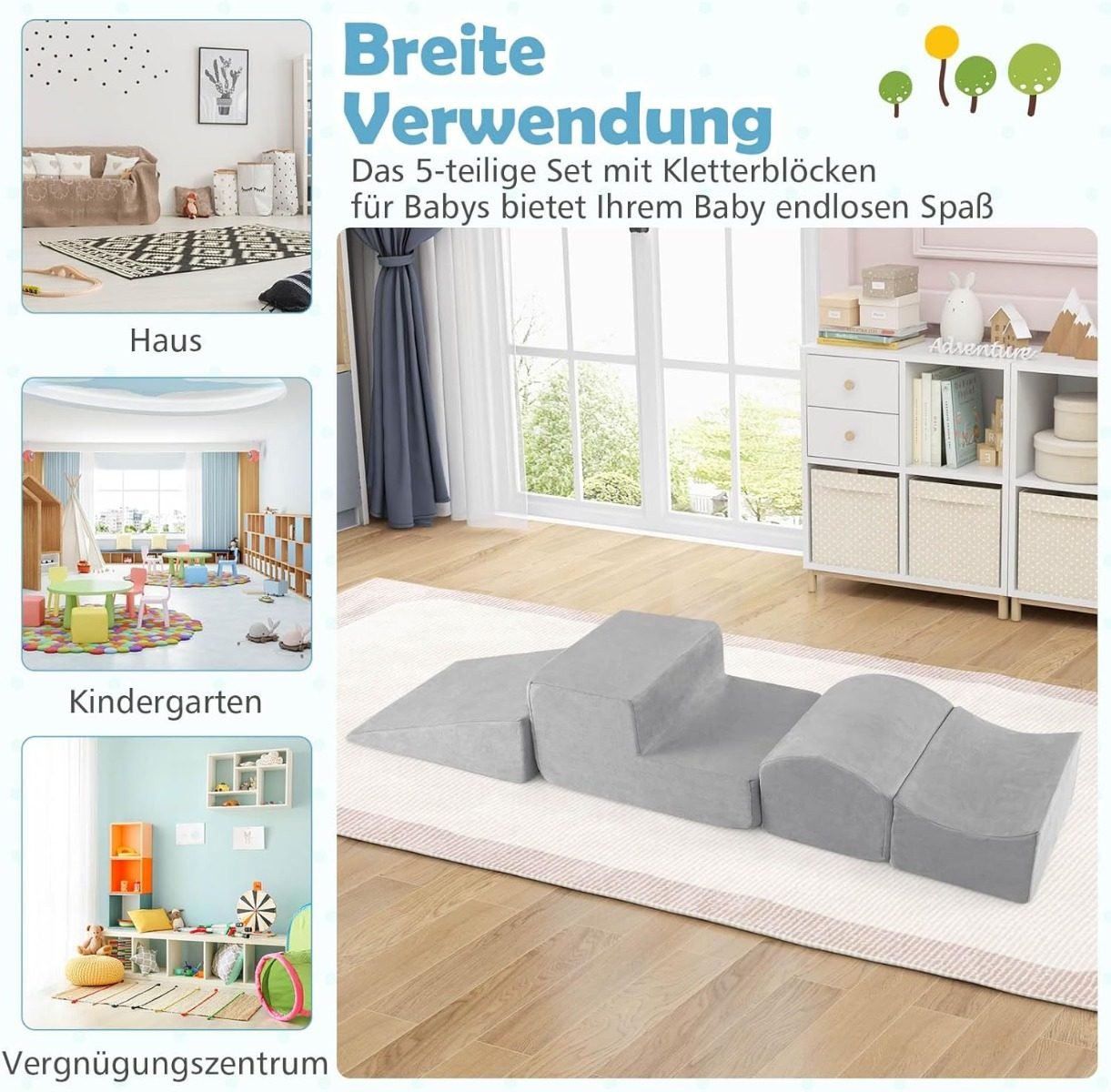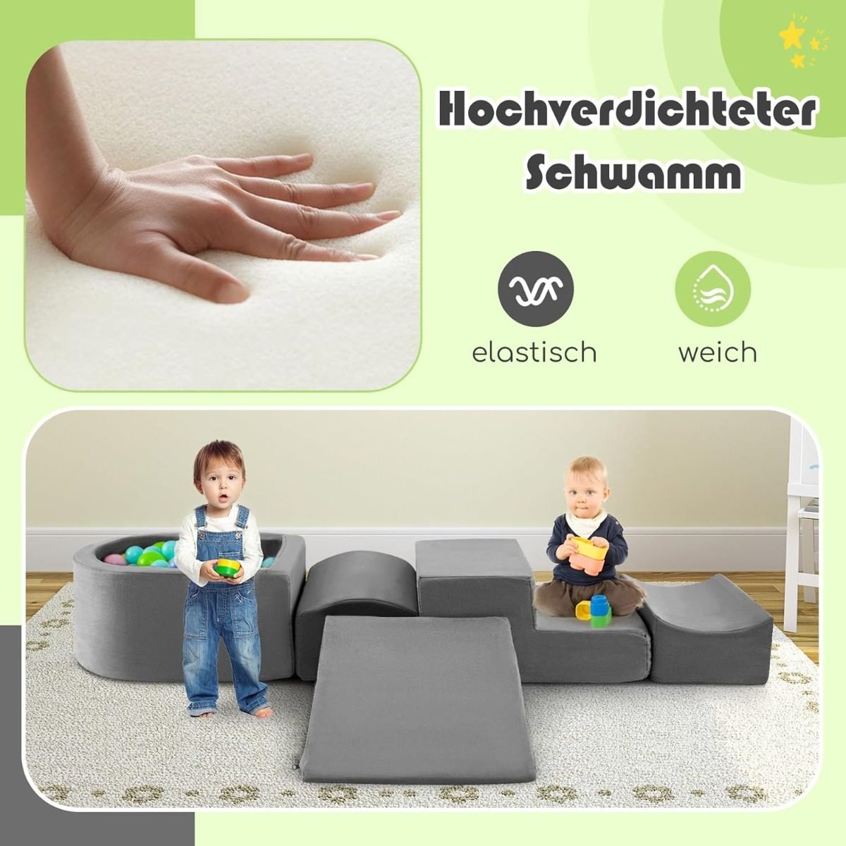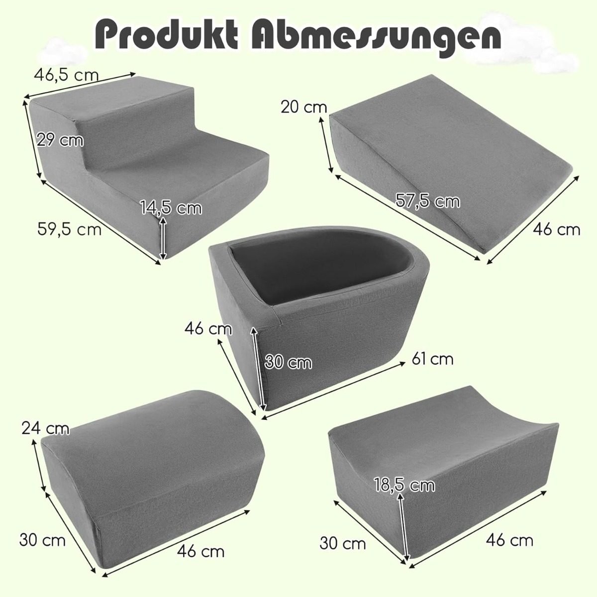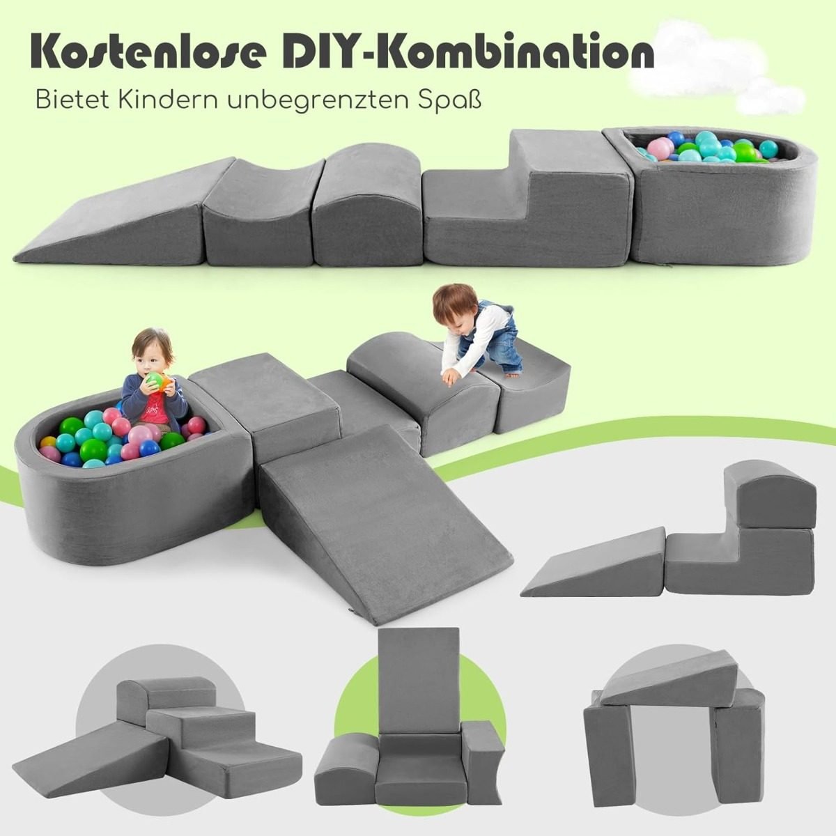 5 dalių minkštų putplasčio blokų komplektas su kamuoliukų baseinu ir nuimamu užvalkalu (Pilka)