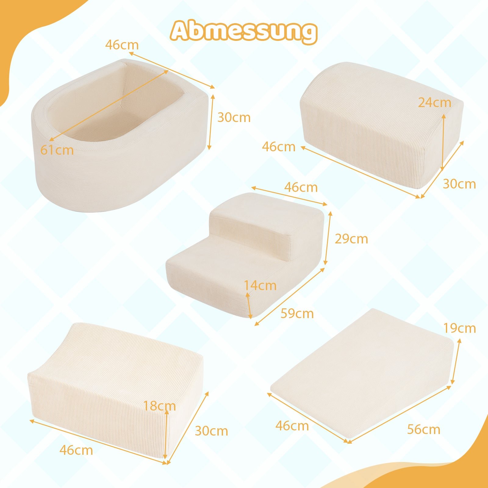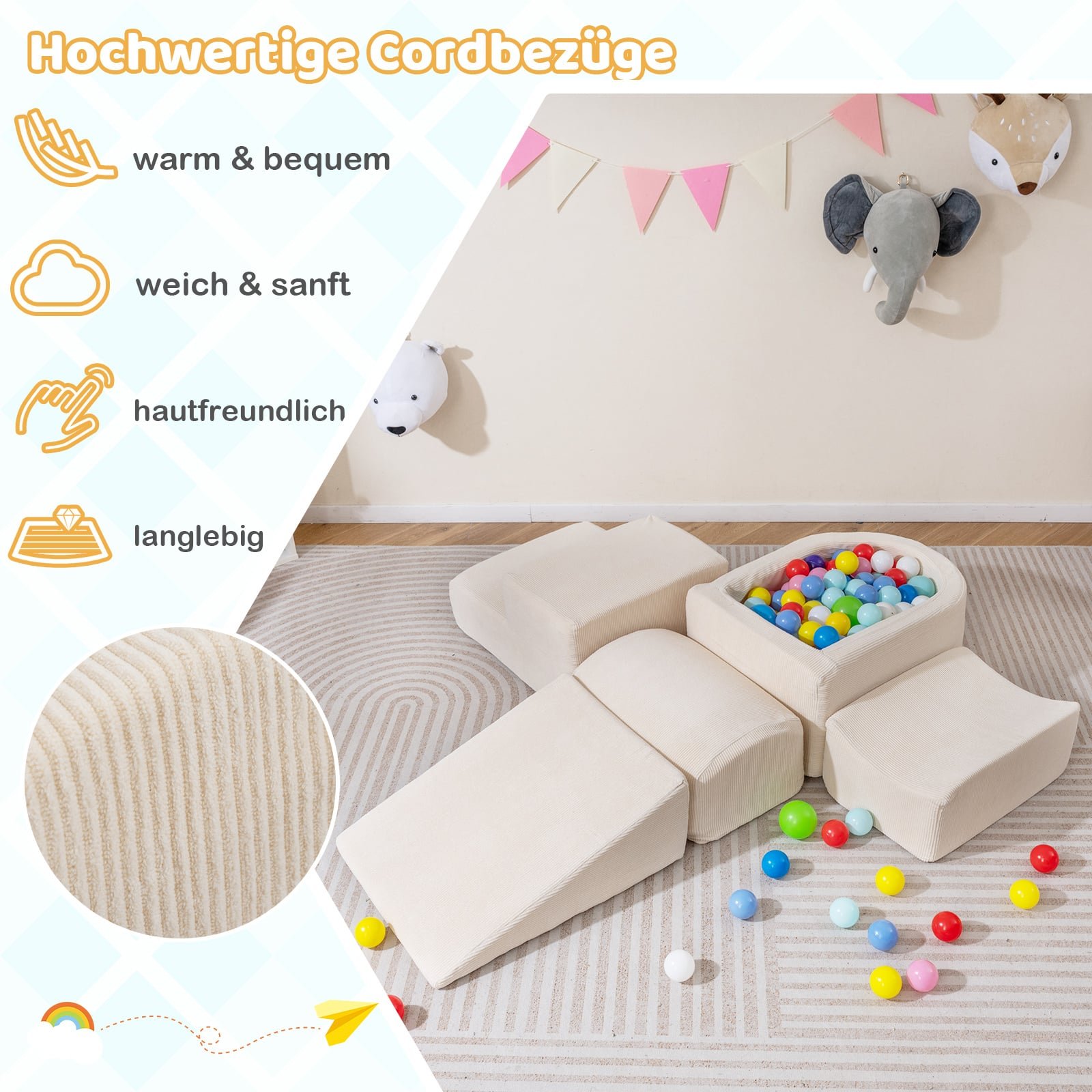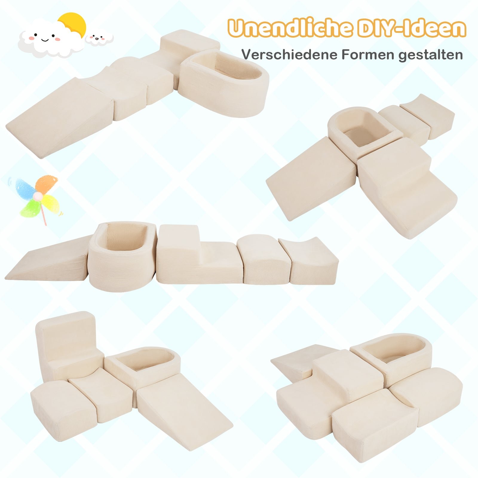 Išlaisvinkite begalinį kūrybiškumą su šiuo 5 dalių kopinėjimo putplasčio rinkiniu vaikams. Jį sudaro kamuoliukų baseinas (kamuoliukai neįeina), čiuožykla, kopėtėlės ir įvairūs blokai, leidžiantys vaikams statyti naujas struktūras ir tyrinėti interaktyvų žaidimų pasaulį. Pagaminti iš aukštos kokybės virvelinio audinio užvalkalų ir didelio tankio putplasčio, šie blokai užtikrina komfortą ir saugumą. Lengvai nuimami ir skalbiami užvalkalai garantuoja higieną ir paprastą priežiūrą.