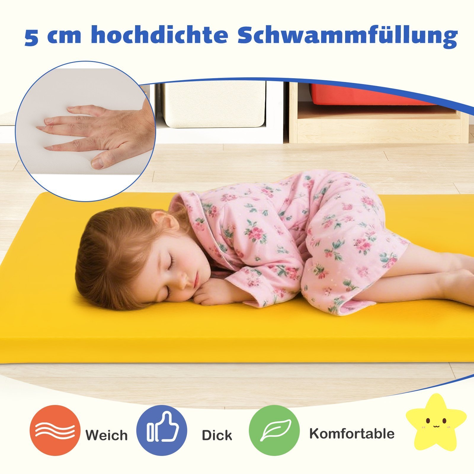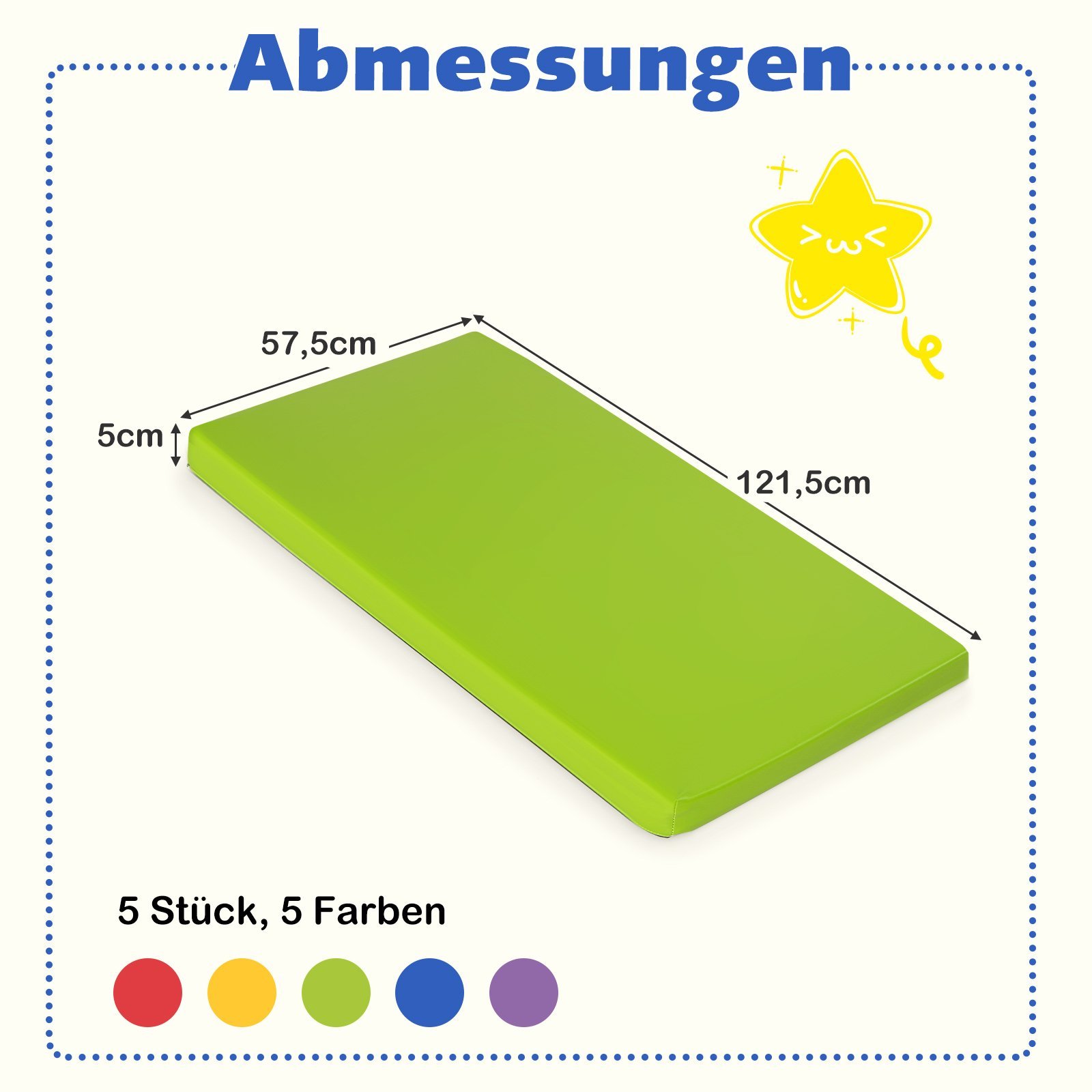 Sukurkite jaukią ir patogią aplinką vaikams su šiuo 5 putplasčio kilimėlių rinkiniu. Šie kilimėliai, užpildyti 5 cm storio minkštu putplasčiu, užtikrina ramų miegą ikimokyklinėse įstaigose ar namuose. Atsparūs vandeniui dirbtinės odos užvalkalai lengvai valomi ir idealiai tinka intensyviam naudojimui, o neslystantis dugnas užtikrina stabilumą.