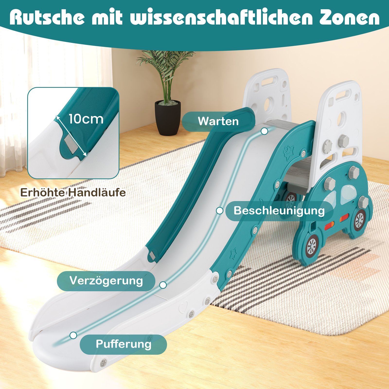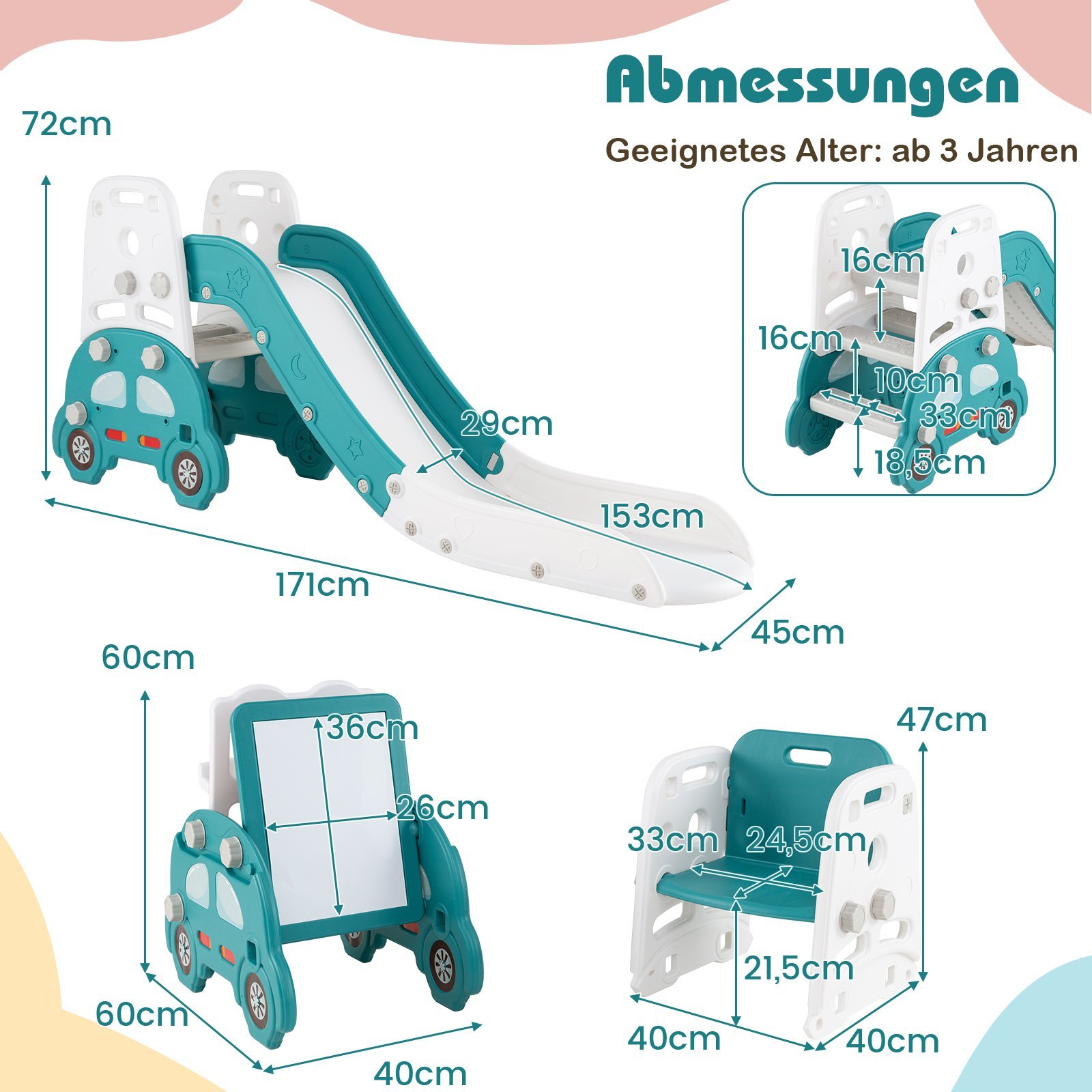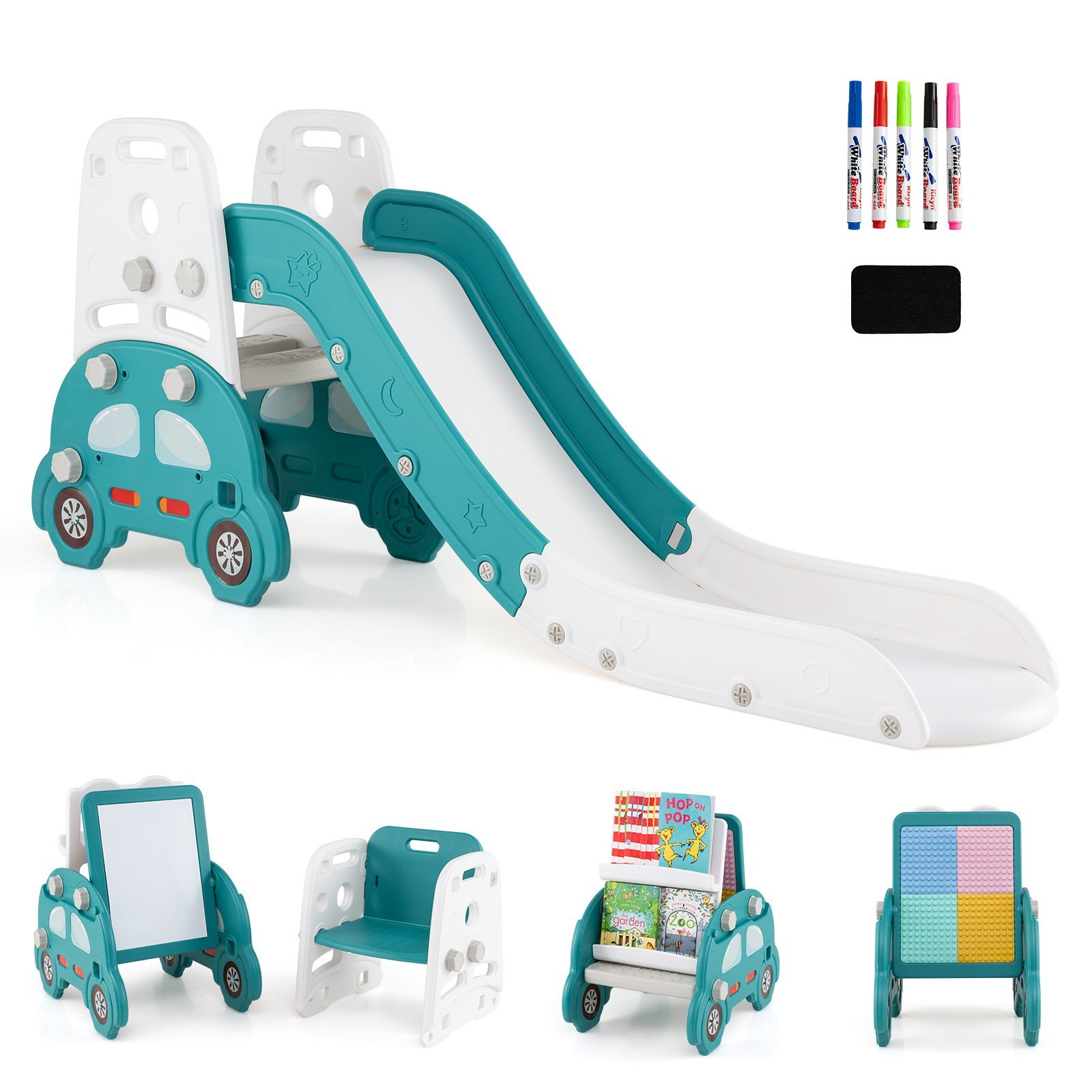 - 5-in-1 daugiafunkcionalumas: Čiuožykla, laipiojimo sienelė, piešimo lenta, knygų lentyna ir kaladėlių konstravimo zona – viskas viename komplekse.