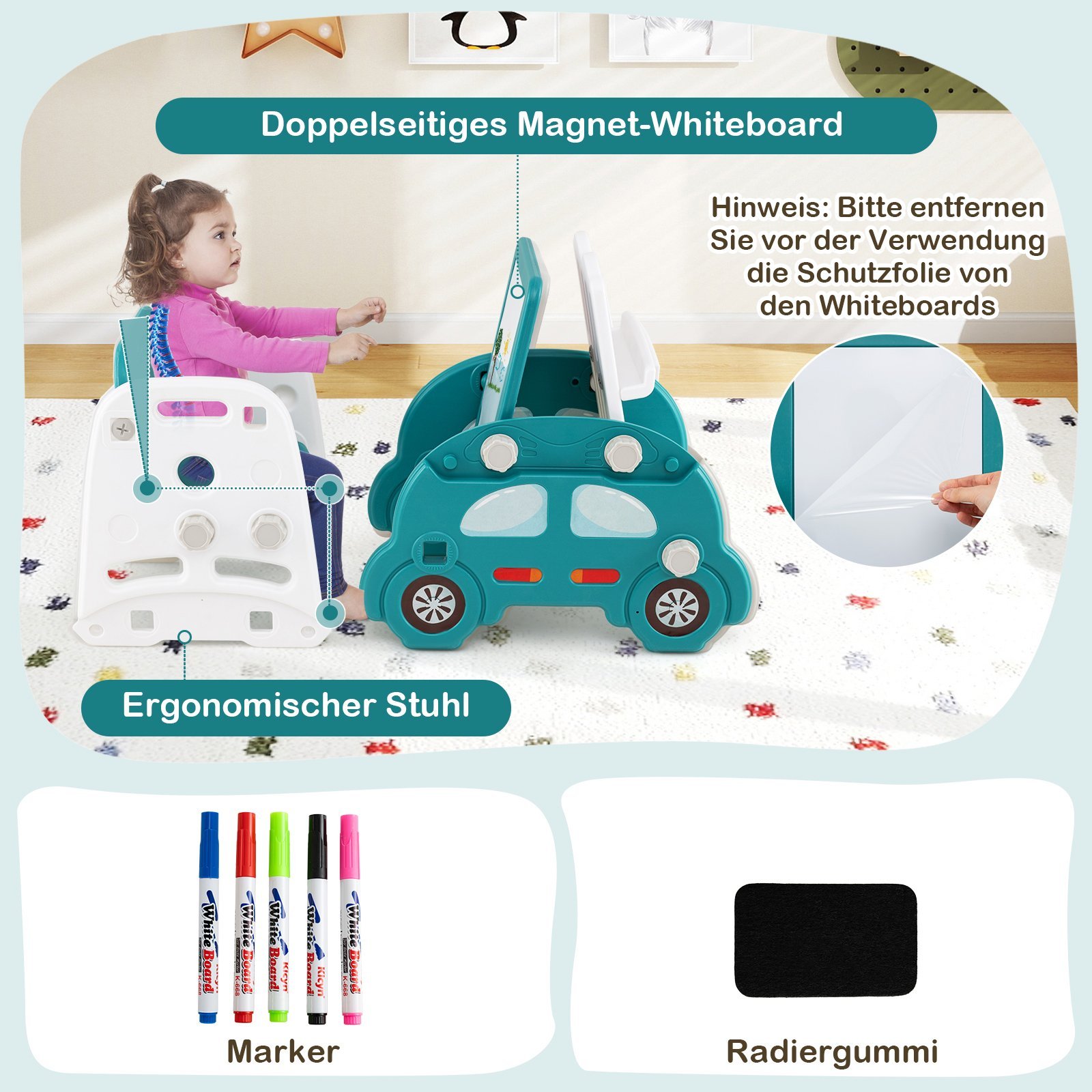 - Kūrybiškumo skatinimas: Dvipusė magnetinė lenta su patogia kėdute, pieštukais ir kempine padeda atsiskleisti meniniams gebėjimams ir skatina kūrybiškumą.