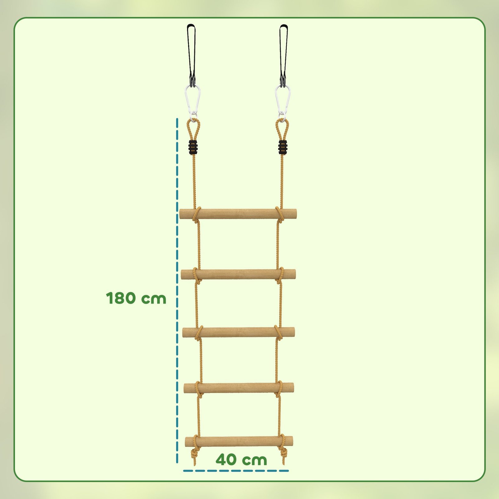 Kopėčios: Medinio strypo matmenys: Ø3,5 x 40 cm, Virvės skersmuo: Ø10 mm, Virvės ilgis: 1,8 m