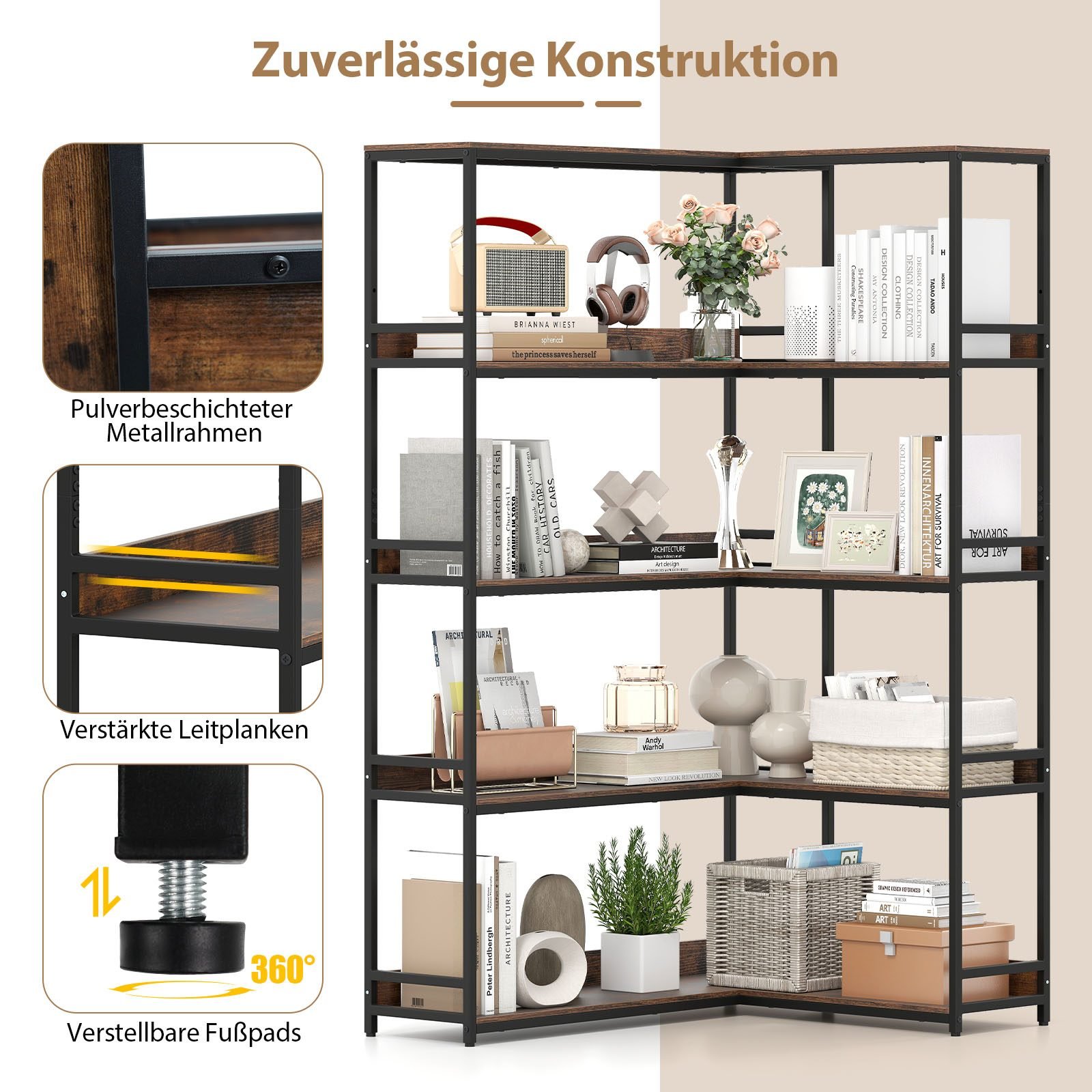 Šis 5 pakopų kampinis lentynos-bokštas su L formos dizainu sukurtas optimaliai išnaudoti erdvę, idealiai tinkantis bet kuriam kampui. Tai puikus sprendimas knygoms, daiktams ir dekoracijoms tvarkingai laikyti, suteikiantis jūsų namams ar biurui modernią ir funkcionalią išvaizdą.