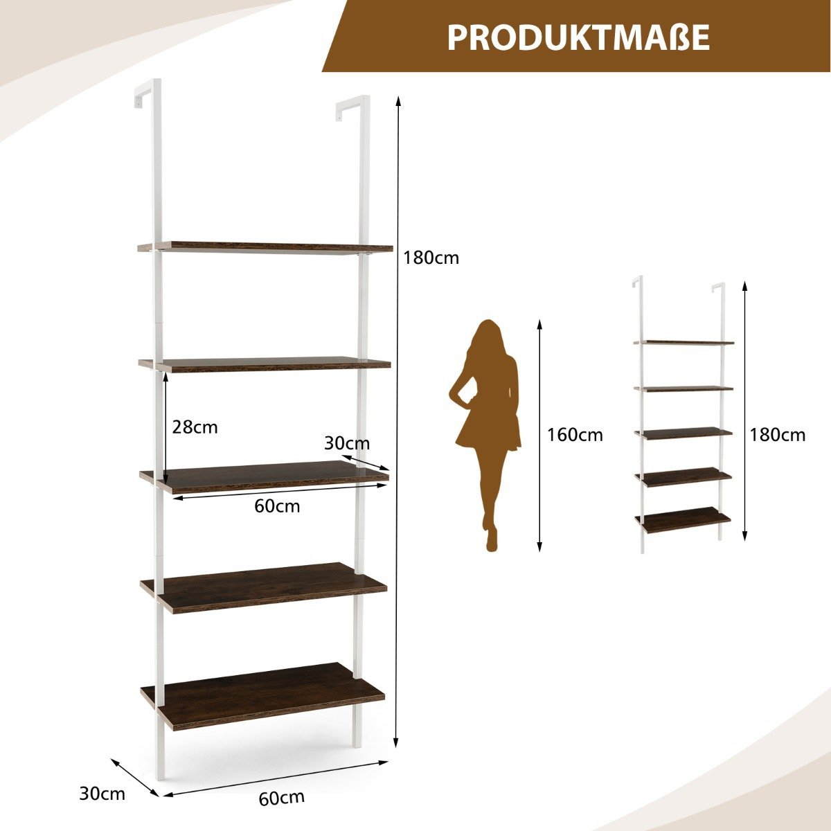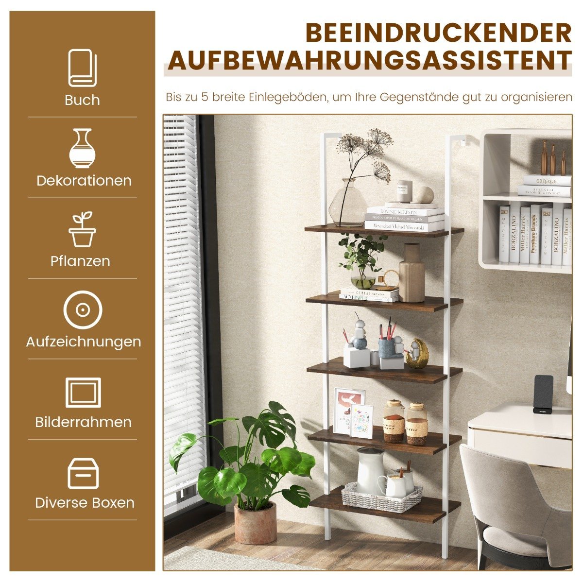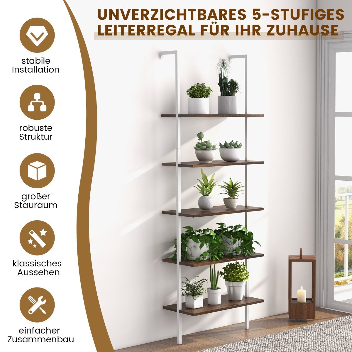 Šis universalus, prie sienos tvirtinamas 5 pakopų laiptuotas lentynos stovas yra puikus pasirinkimas jūsų namams ar biurui. Jo tvirta konstrukcija ir funkcionalus dizainas užtikrina saugumą bei patogumą.