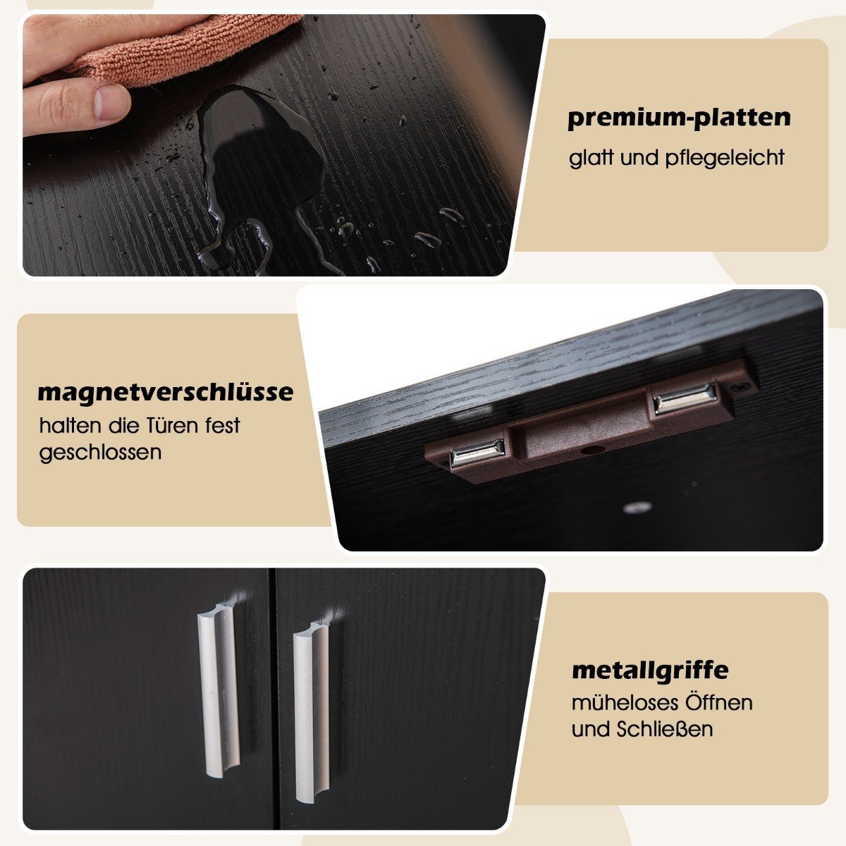 - Maksimaliai išnaudokite saugojimo vietą: trys atviros lentynos, patogi viršutinė plokštė ir erdvi uždara spintelė leis tvarkingai sutalpinti visus daiktus.