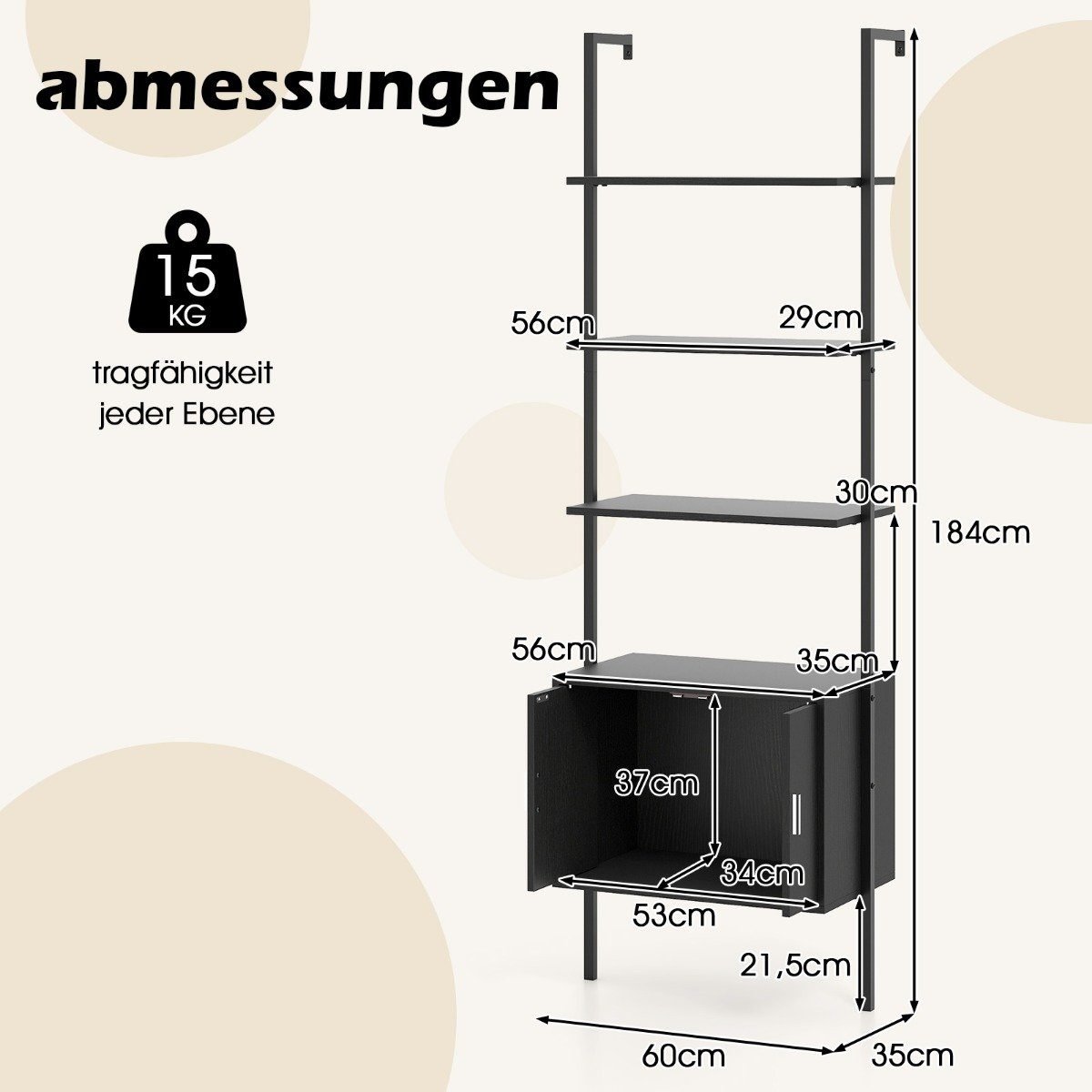5 pakopų laiptuotas lentynų stovas su spintele (Juoda)