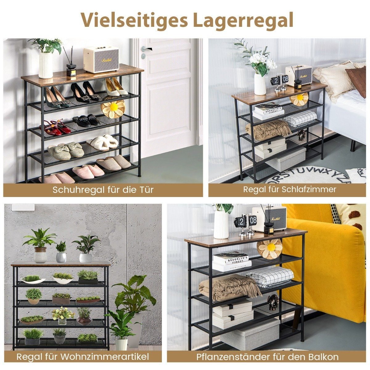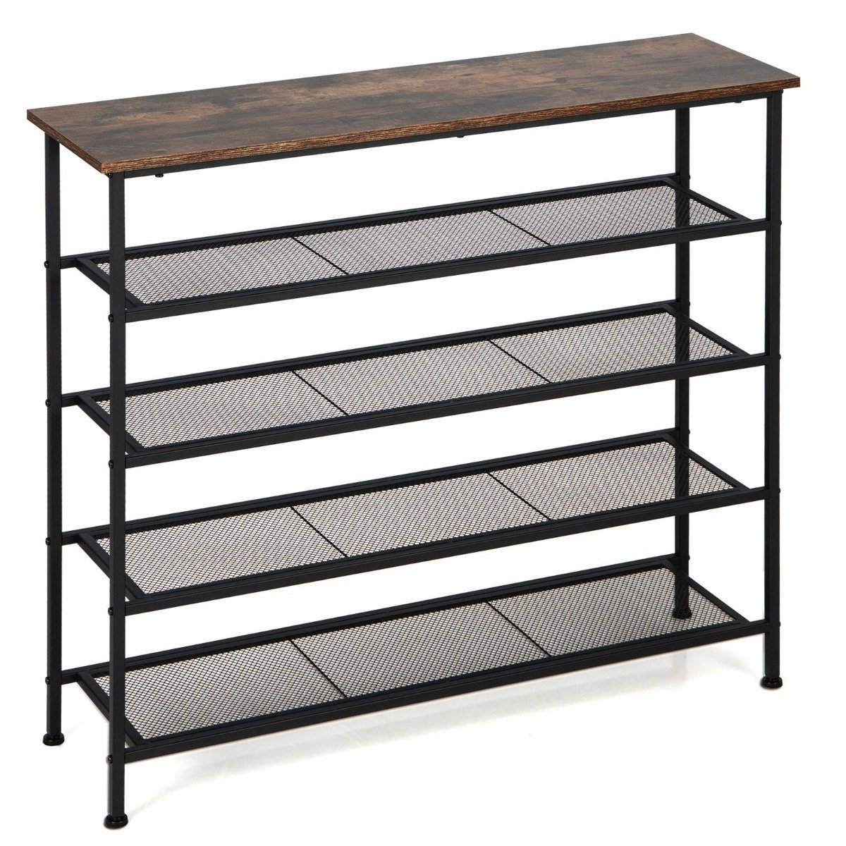 - Daug vietos: 4 atviros tinklinės lentynos sutalpins 16-20 batų porų, o viršutinė medžio rašto plokštė puikiai tiks smulkiems daiktams ar dekoracijoms.