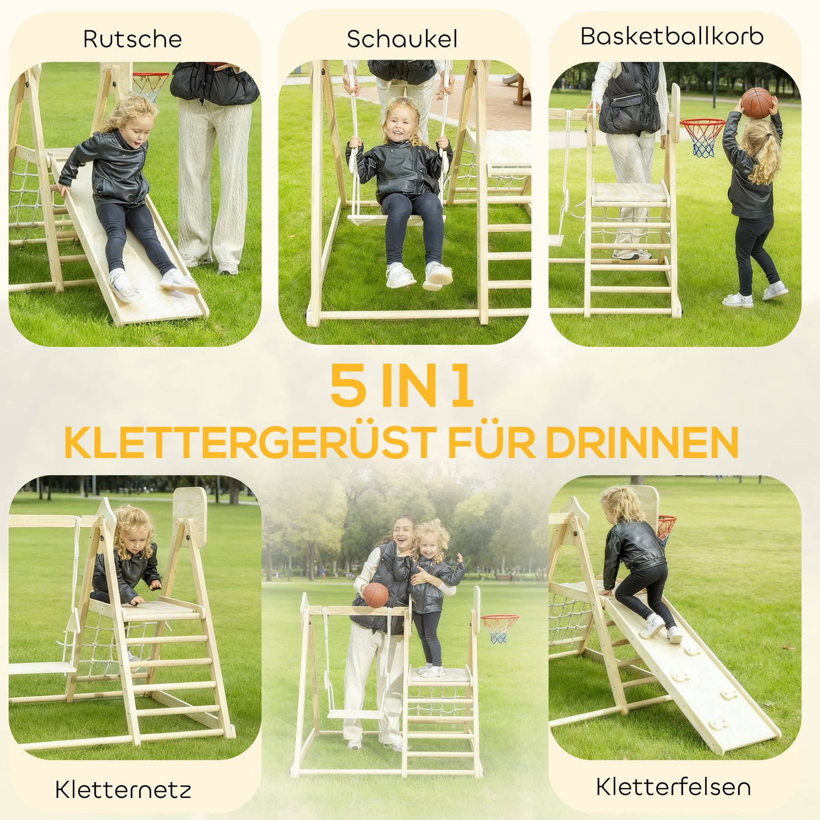 Šis laipiojimo kompleksas mažyliams pavers jūsų namus saugia nuotykių žaidimų aikštele, kurioje patys mažiausieji galės siausti ir tobulėti. Pagamintas iš tvirto medžio, su sūpynėmis, čiuožykla, kopimo plokšte, krepšinio lanku ir laipiojimo sienele, jis palaiko pusiausvyros, koordinacijos ir pasitikėjimo savimi ugdymą, paverčiant kiekvieną dieną žaisminga augimo patirtimi.