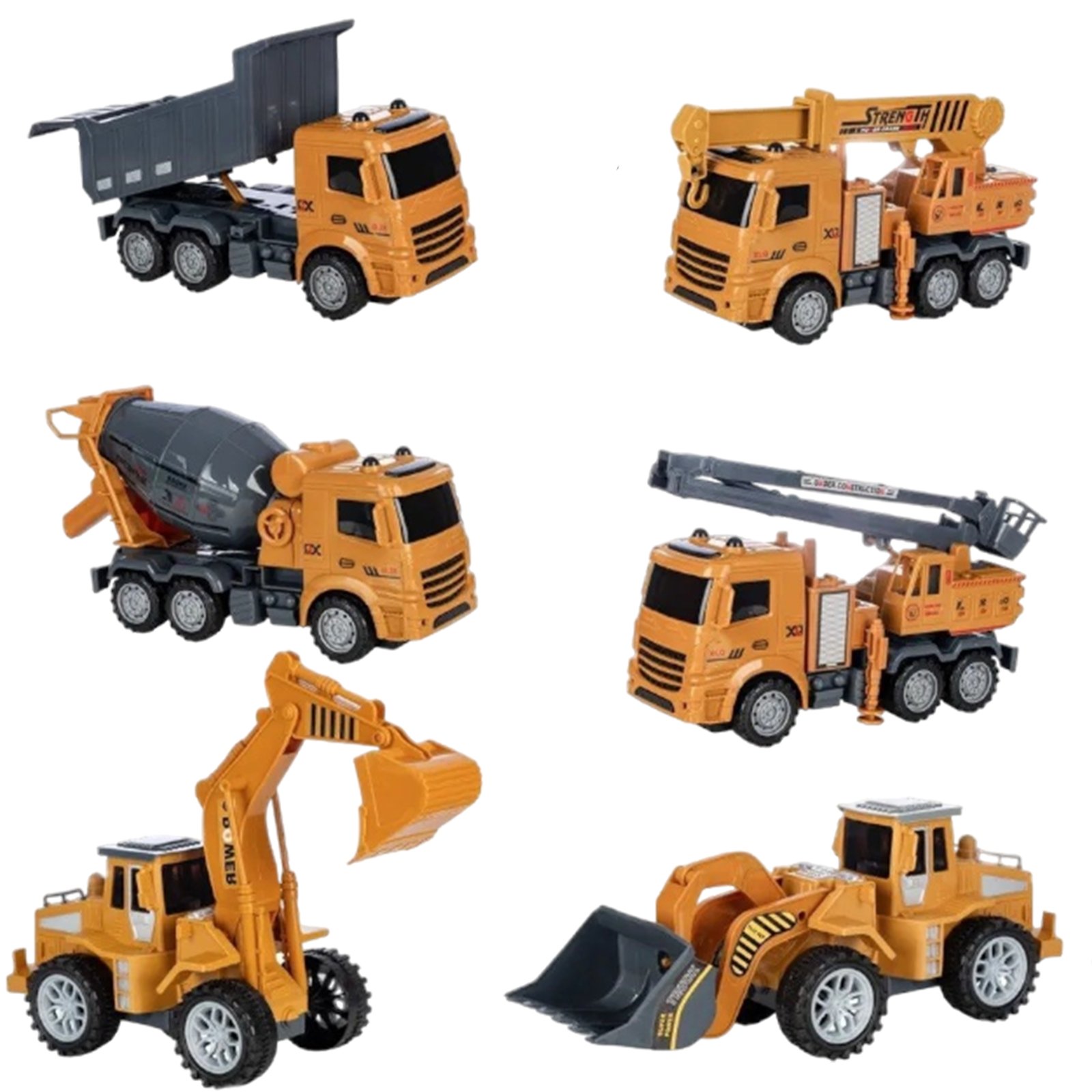 - Modeliai turi įvairias judančias dalis: kilnojamus kaušus, besisukančius maišytuvus, ištraukiamas kranų strėles ir atverčiamus kėbulus.