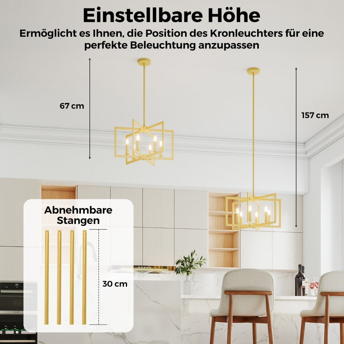 - Reguliuojamas aukštis nuo 67 iki 157 cm, tinkantis įvairioms luboms (lygioms ir nuožulnioms).
