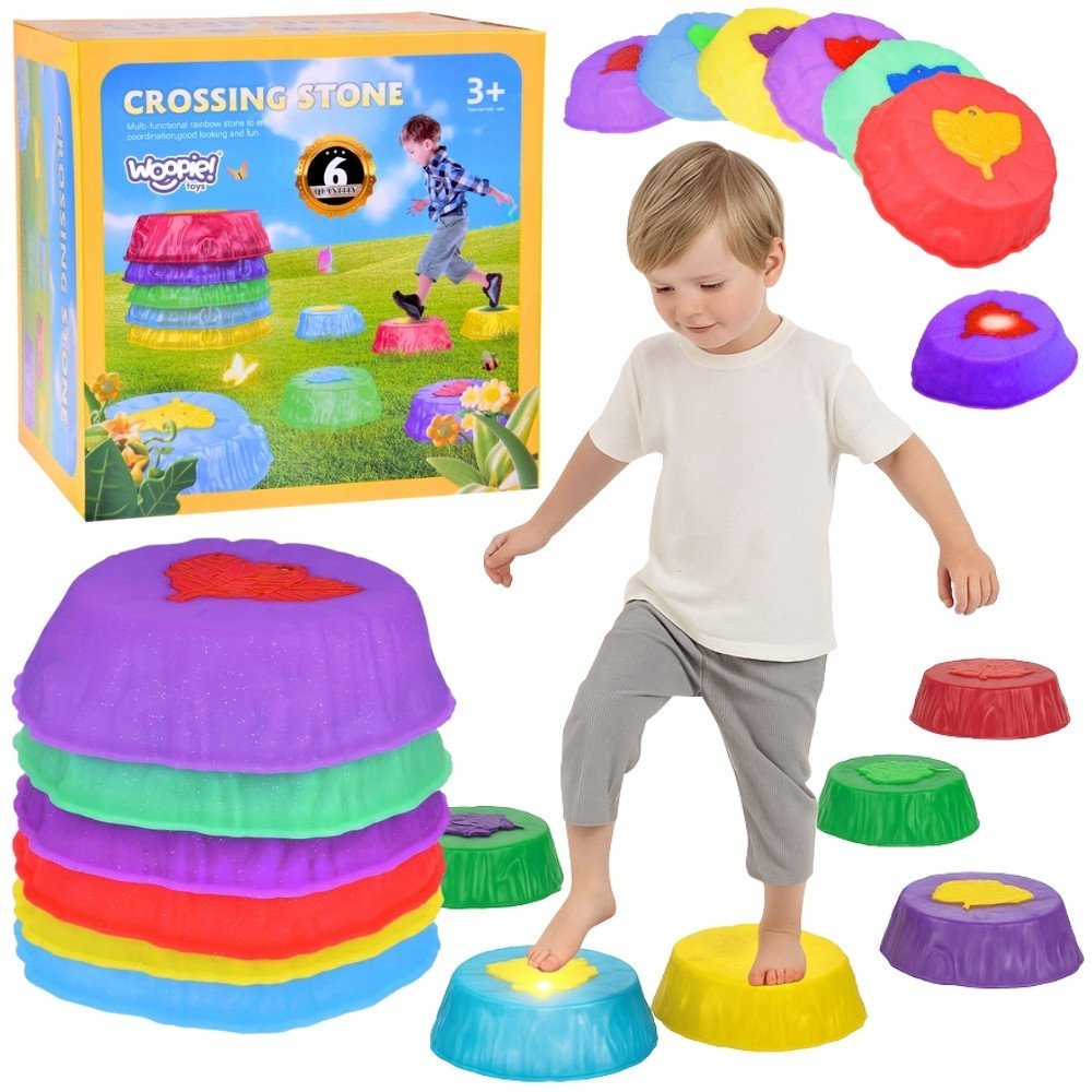 „Woopie“ šviečiančių balansavimo akmenų rinkinys puikiai tiks mažiesiems nuotykių ieškotojams! 6 spalvingi, šviečiantys balansavimo akmenys leidžia sukurti įdomų kliūčių ruožą tarsi iš pasakos – tiek namuose, tiek lauke. Lipimas, šokinėjimas ir balansavimas lavina vaiko motoriką, pusiausvyrą ir koncentraciją, teikdami daug džiaugsmo.