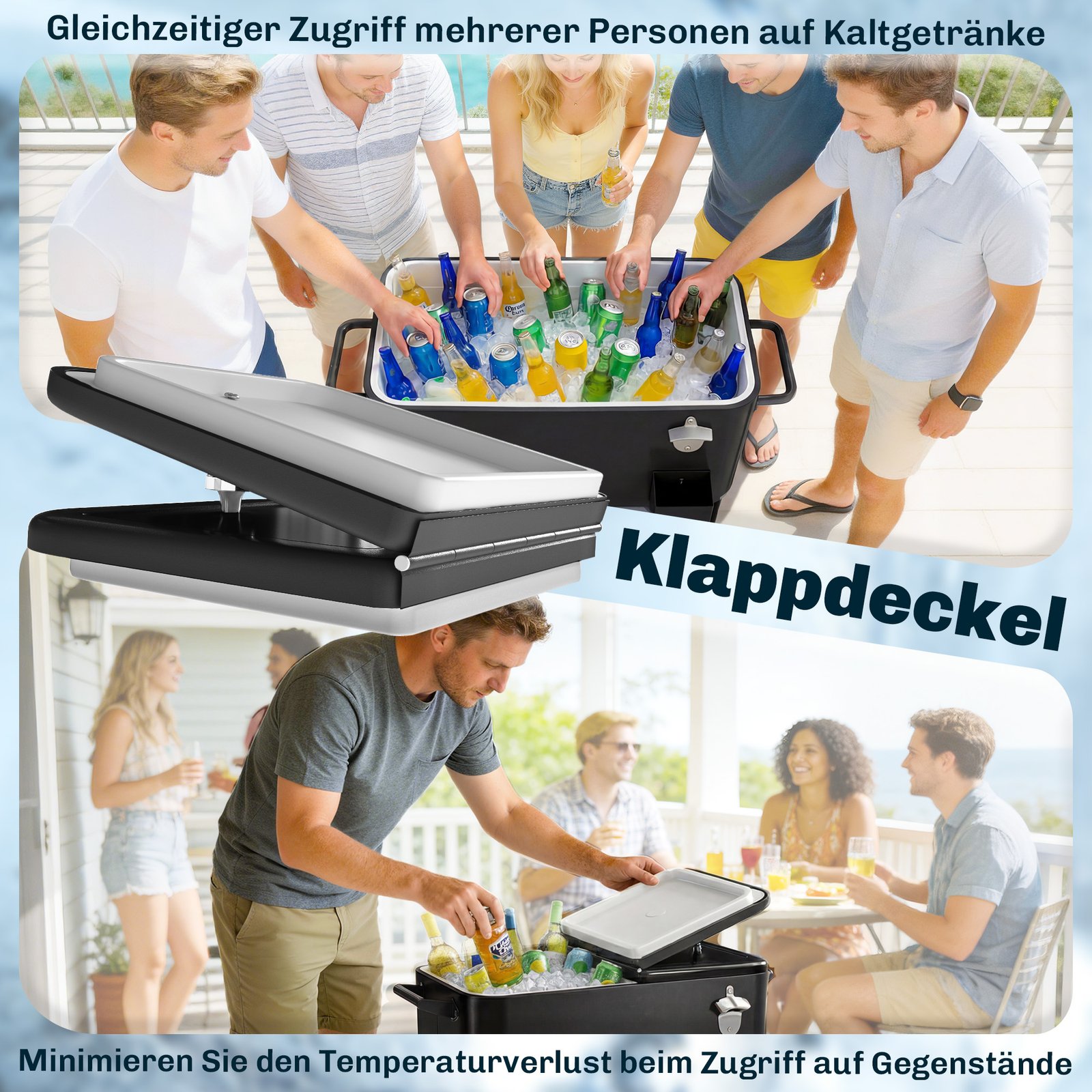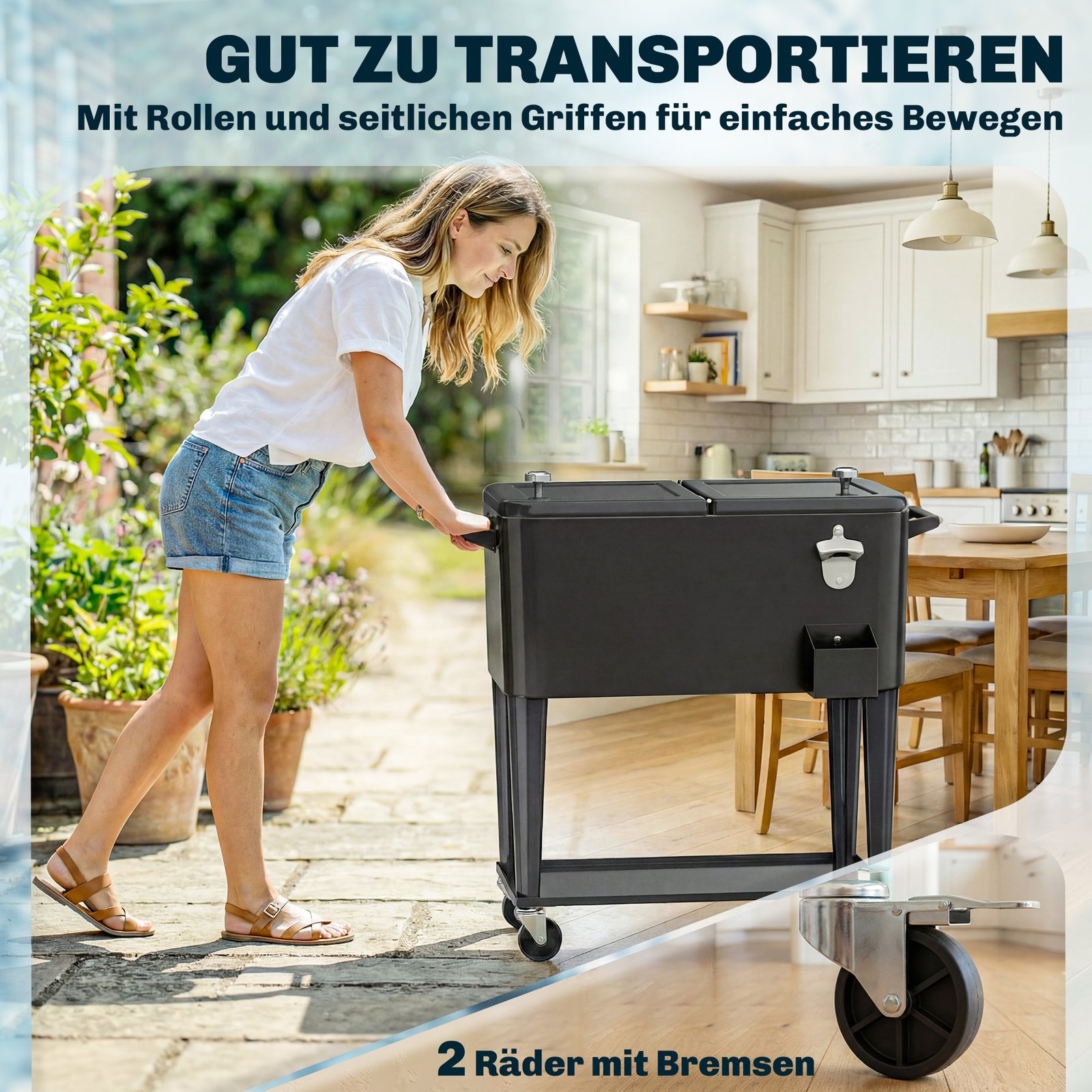 Su 76 litrų talpa ir atspariu oro sąlygoms išoriniu korpusu, šis šaldytuvas ant ratukų palaiko gėrimus šaltus valandų valandas. Tiesiog užpildykite ledu / šaldymo paketais (į komplektą neįeina). Lengvai riedantys serviravimo vežimėlio ratukai leidžia be vargo jį perkelti, todėl gaivieji gėrimai visada bus po ranka – puikiai tinka kepsnių vakarėliams, sodo šventėms ir vasaros renginiams.