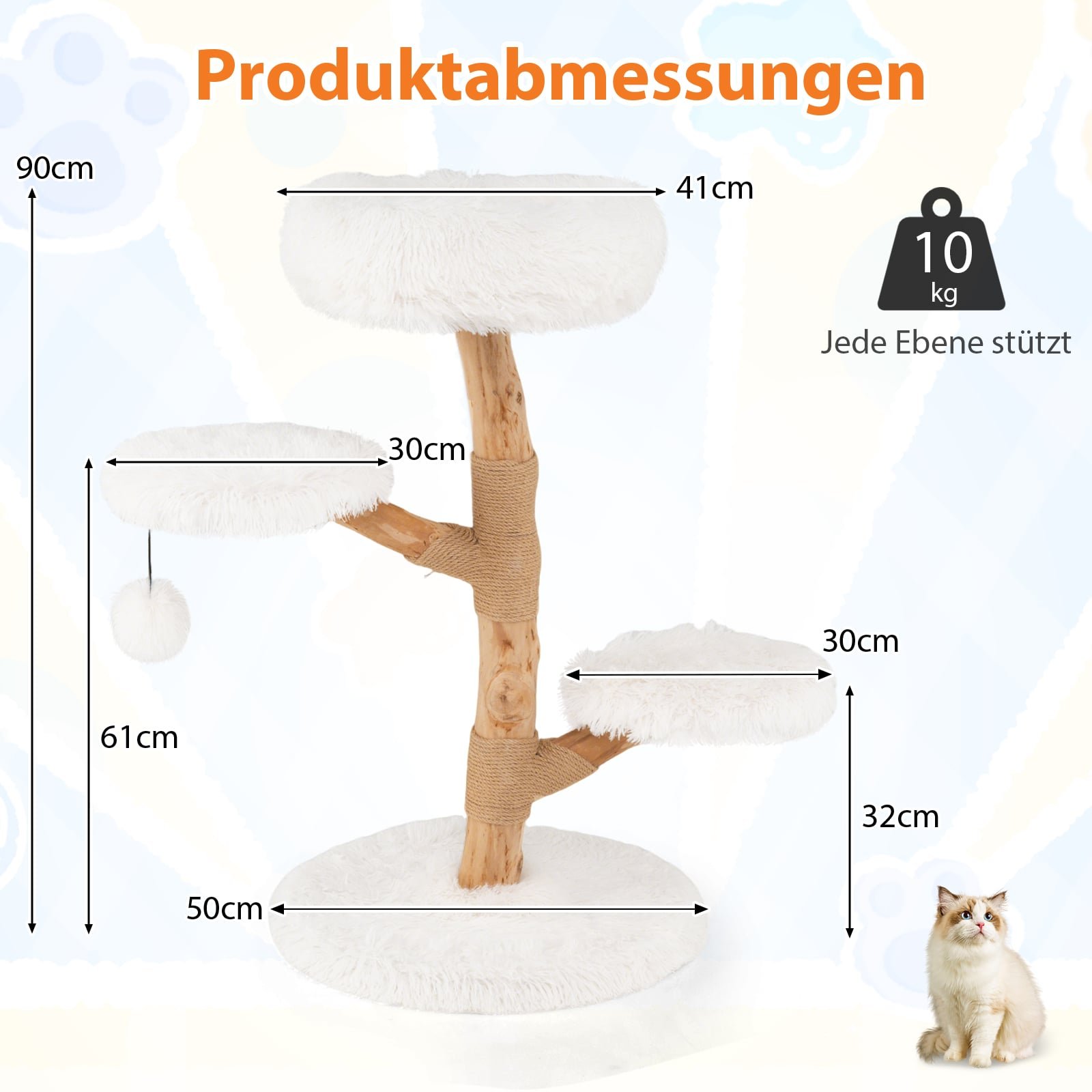 90 cm aukščio kriaušės medienos kačių bokštas su apžvalgos platforma (Balta)