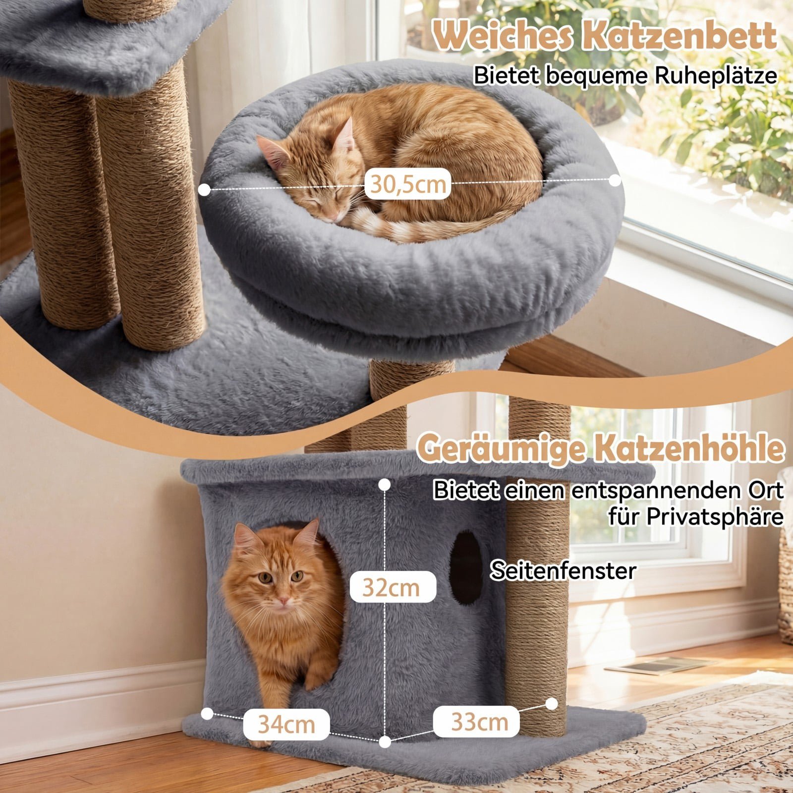 - Minkštas kačių guolis ir namelis su langu suteikia privačias poilsio vietas.