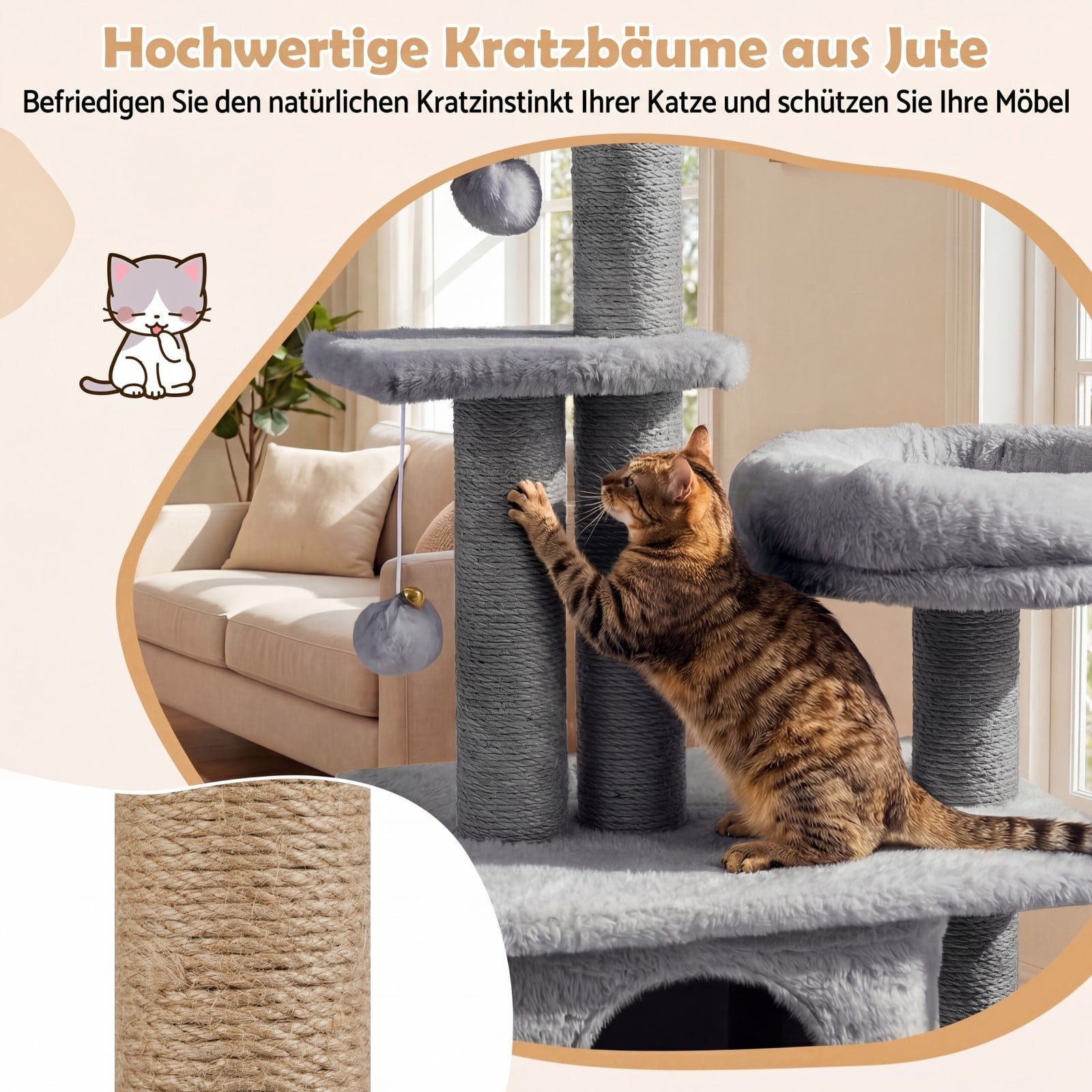 - Sizalio pluoštu apvynioti draskymo stulpai patenkina natūralų draskymo poreikį ir apsaugo baldus.