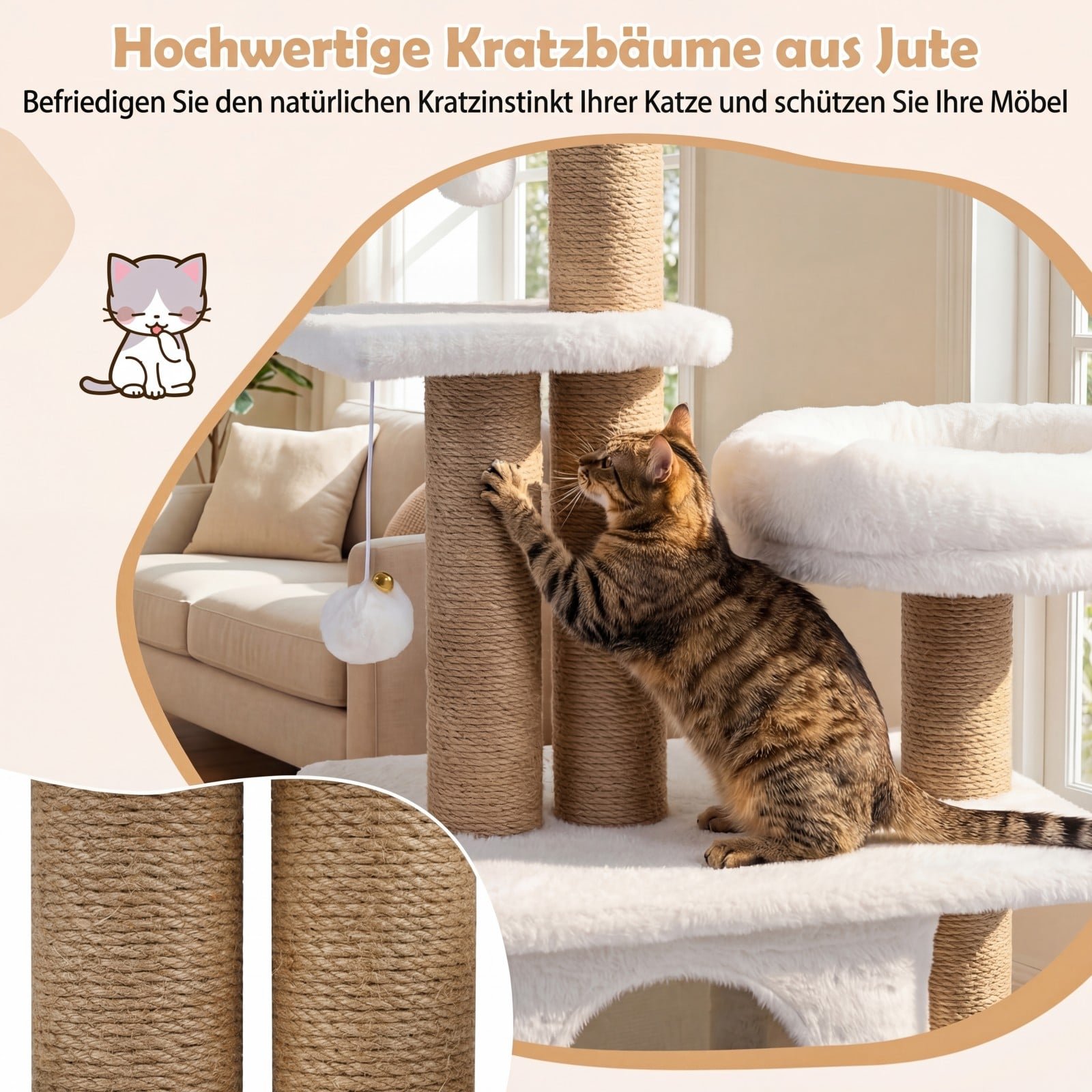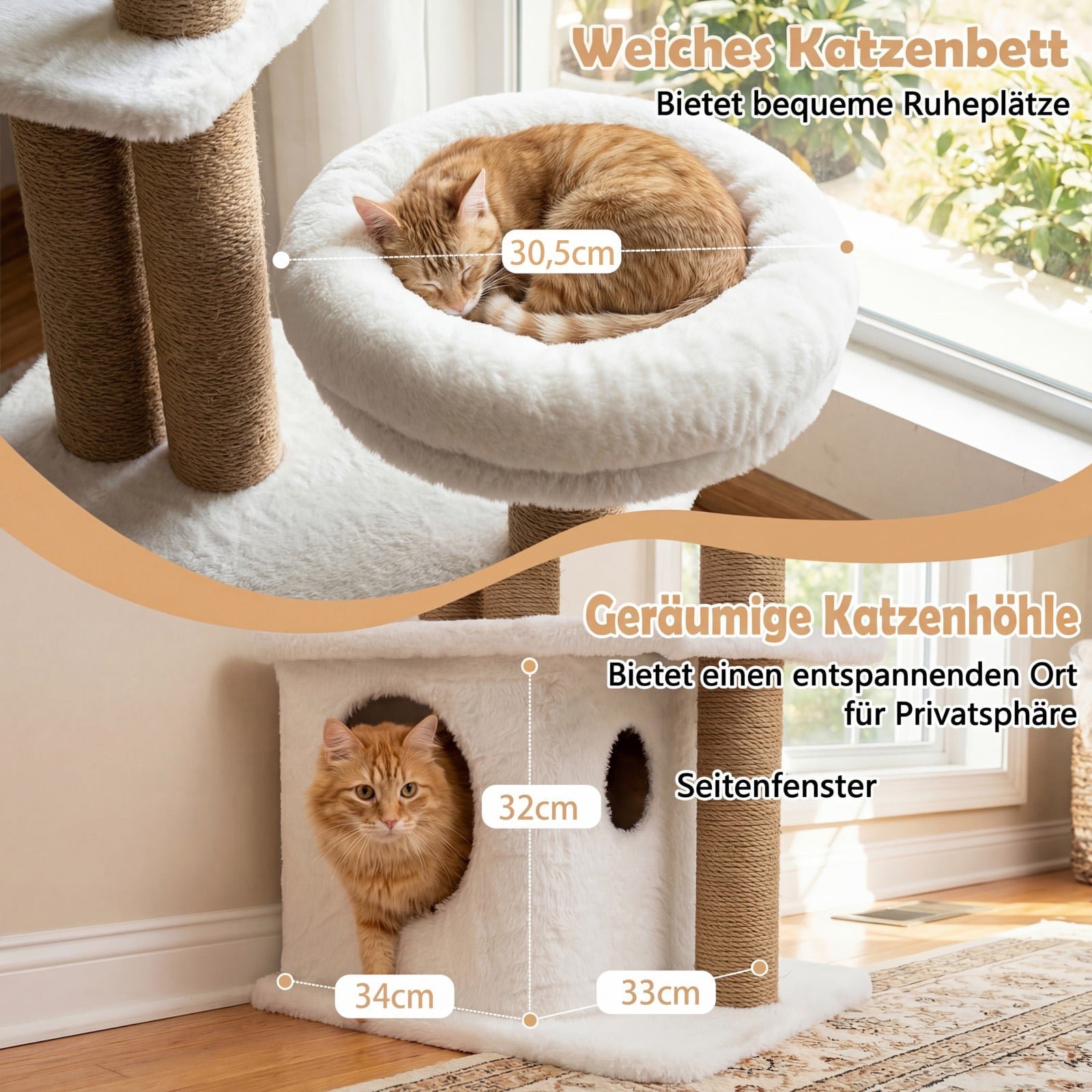 - Džiutu apvynioti draskymo stulpai patenkina kačių draskymo instinktą ir saugo baldus, o 2 pakabinami kamuoliukai užtikrina interaktyvų žaidimą.