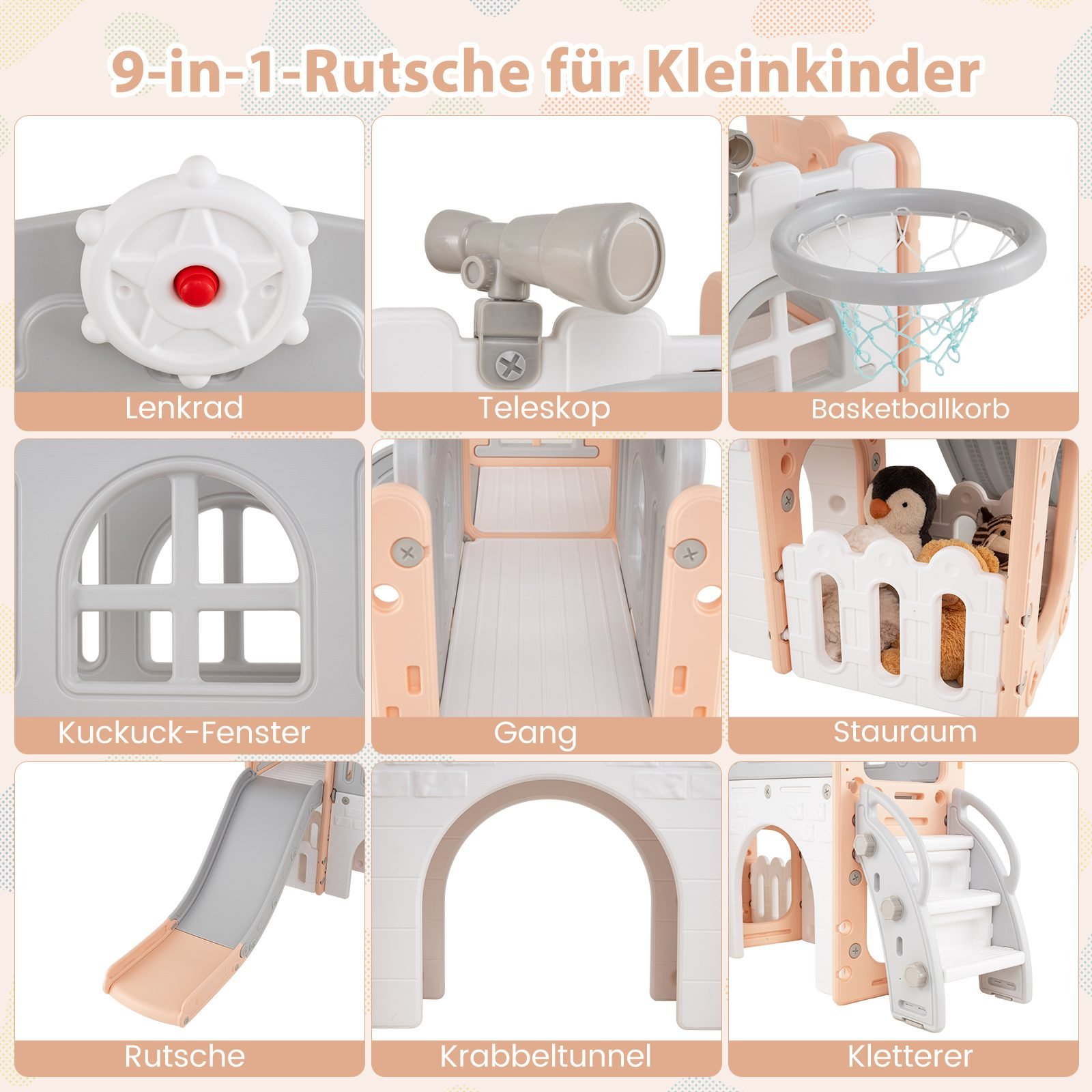 9in1 Vaikų žaidimų aikštelė su krepšinio lanku ir tuneliu (Rožinė)