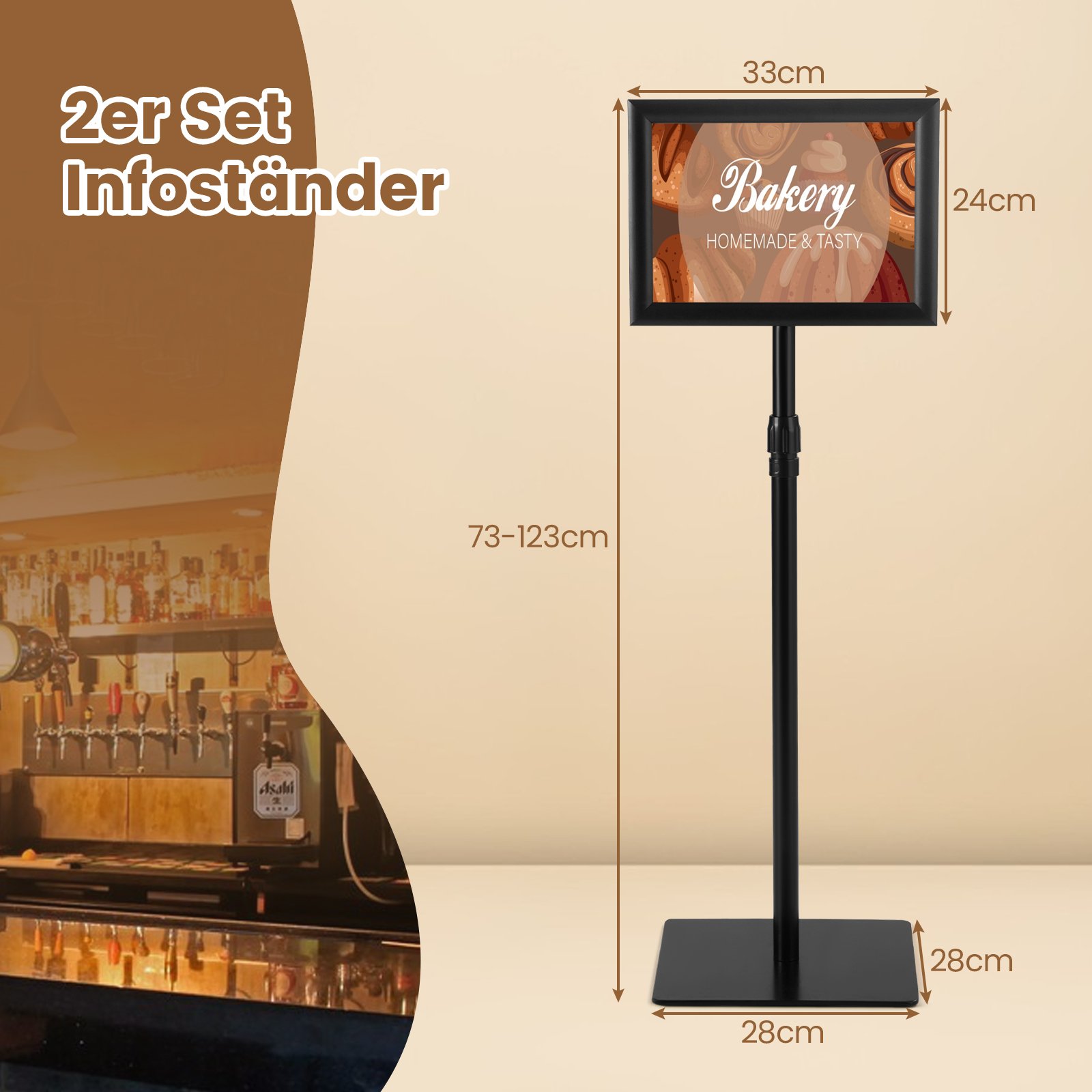 Pritaikykite savo reklaminius pranešimus naudodami šį dviejų reguliuojamų informacinių stendų rinkinį. Kiekvienas stovas leidžia lanksčiai reguliuoti aukštį, užtikrindamas, kad plakatai, meniu ar skelbimai būtų rodomi idealiame matomumo aukštyje bet kurioje aplinkoje. Visiškai pasukamas rėmas užtikrina tiek vertikalų, tiek horizontalų demonstravimą, o tvirtas aliuminio lydinio rėmas ir sunkus metalinis pagrindas garantuoja patikimą stabilumą bei ilgaamžiškumą.