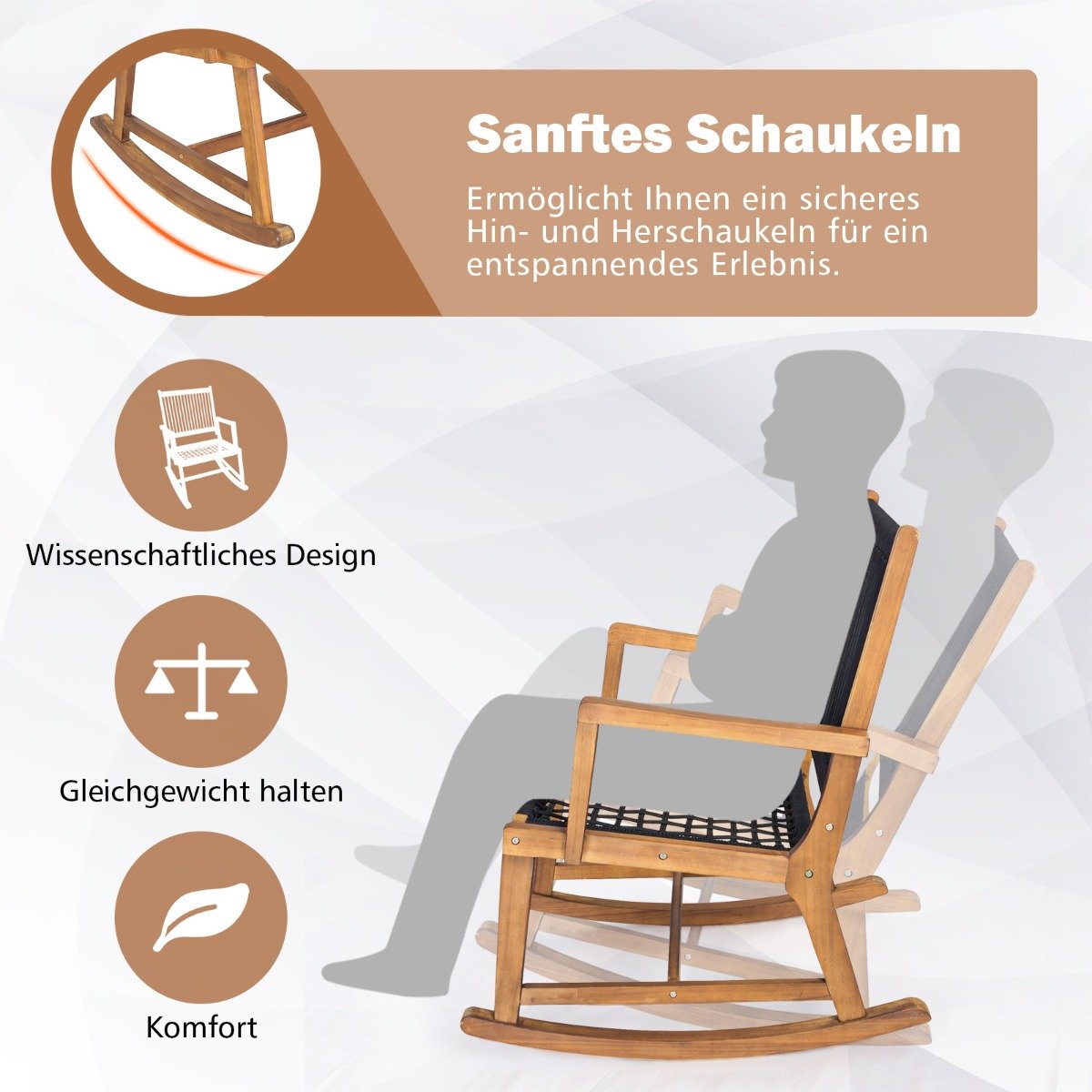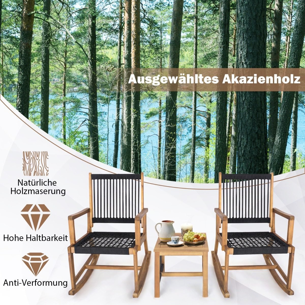 Mėgaukitės ramiais rytais ar jaukiais vakarais su šiuo elegantišku lauko poilsio komplektu. Supamieji krėslai ir patogus staliukas sukurs tobulą erdvę jūsų poilsiui lauke.