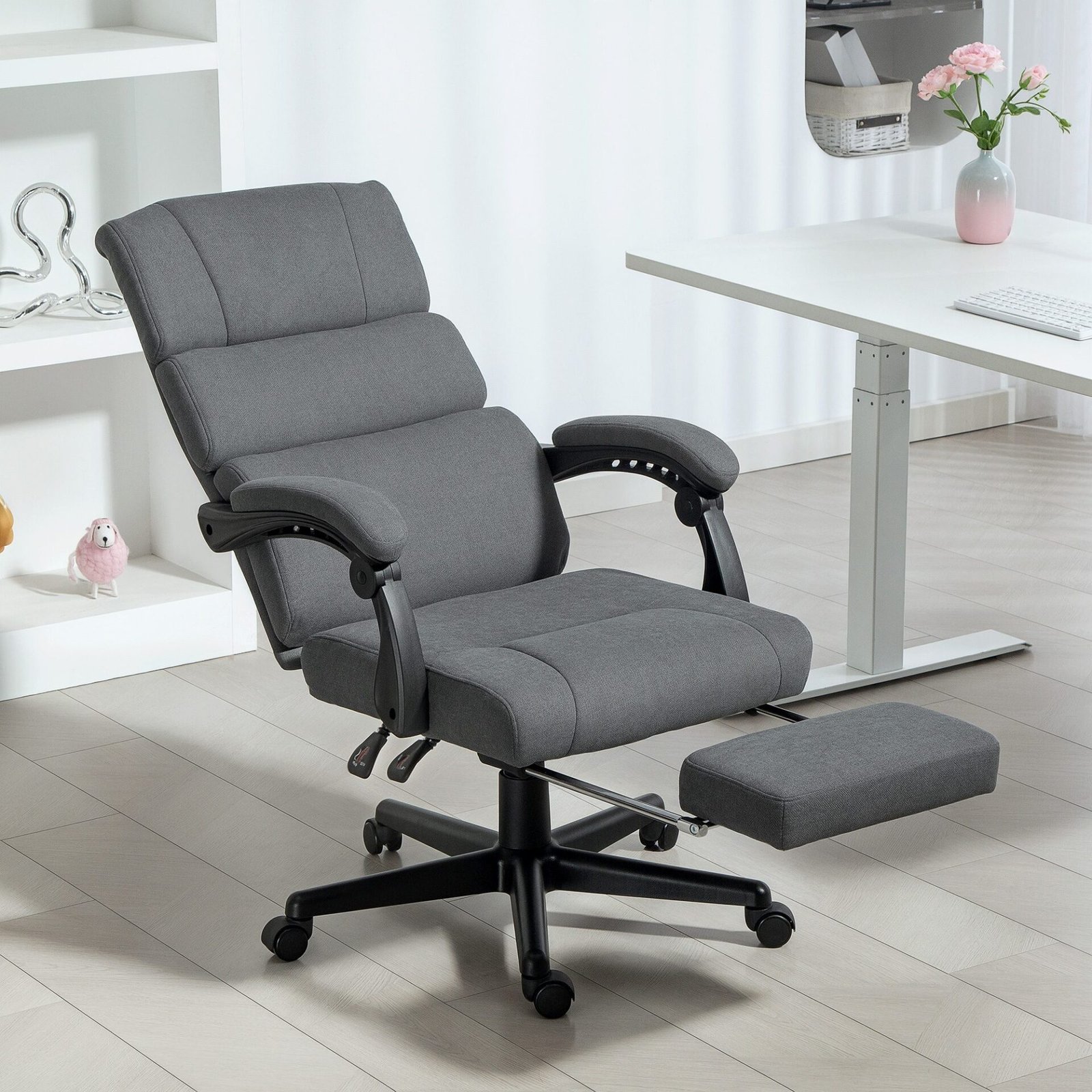 ✔ 135° laipsnių bepakopis atlošas ir stalo kėdės kojų atrama suteikia galimybę patogiai nusnausti, padidinant darbo efektyvumą