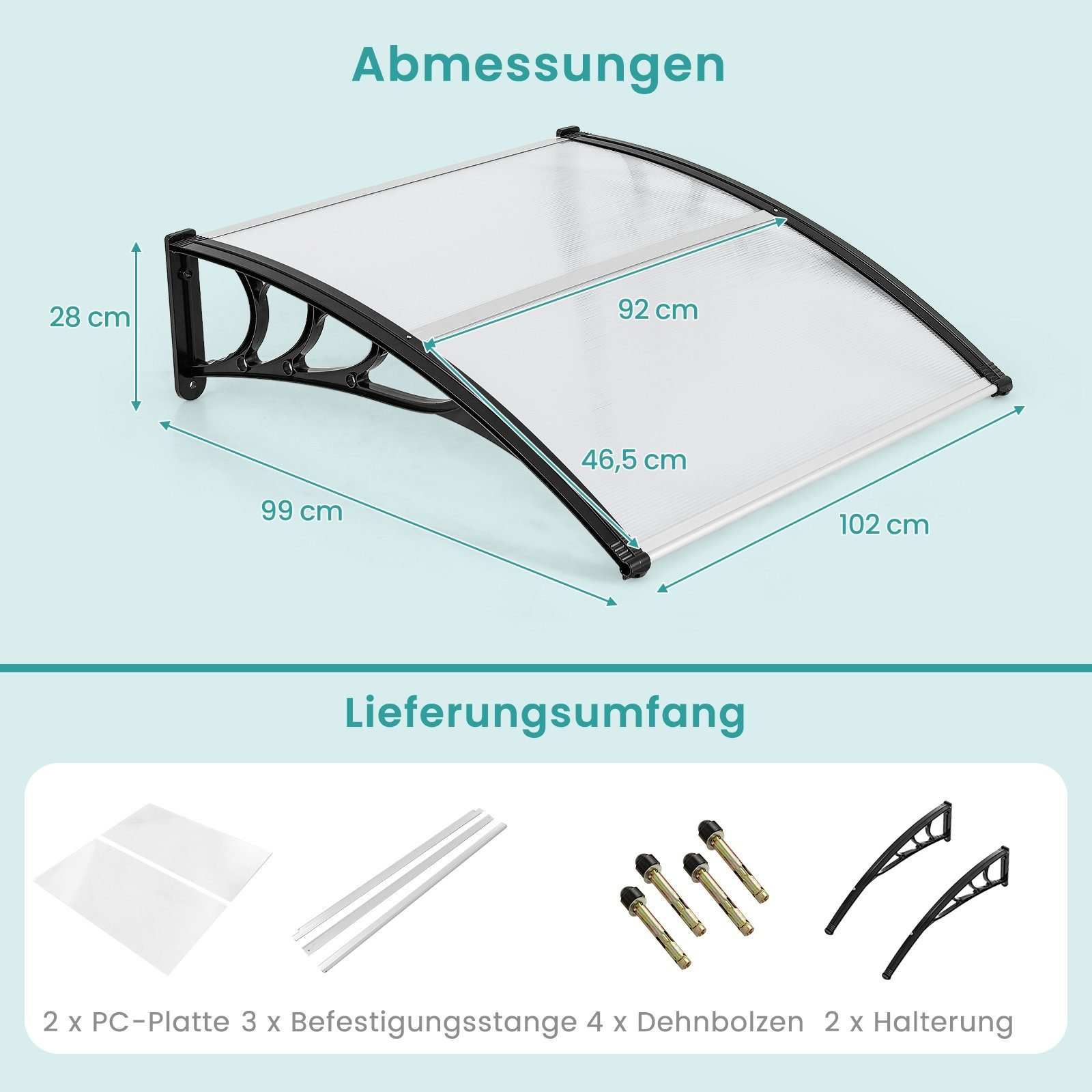 Suteikite savo namams ar verslui elegantišką ir praktišką apsaugą su šiuo aukštos kokybės stogeliu. Sukurtas apsaugoti nuo lietaus, sniego ir kenksmingų saulės spindulių, jis padės išlaikyti jūsų įėjimą sausą ir švarų, taip pat apsaugos jūsų interjerą nuo drėgmės.