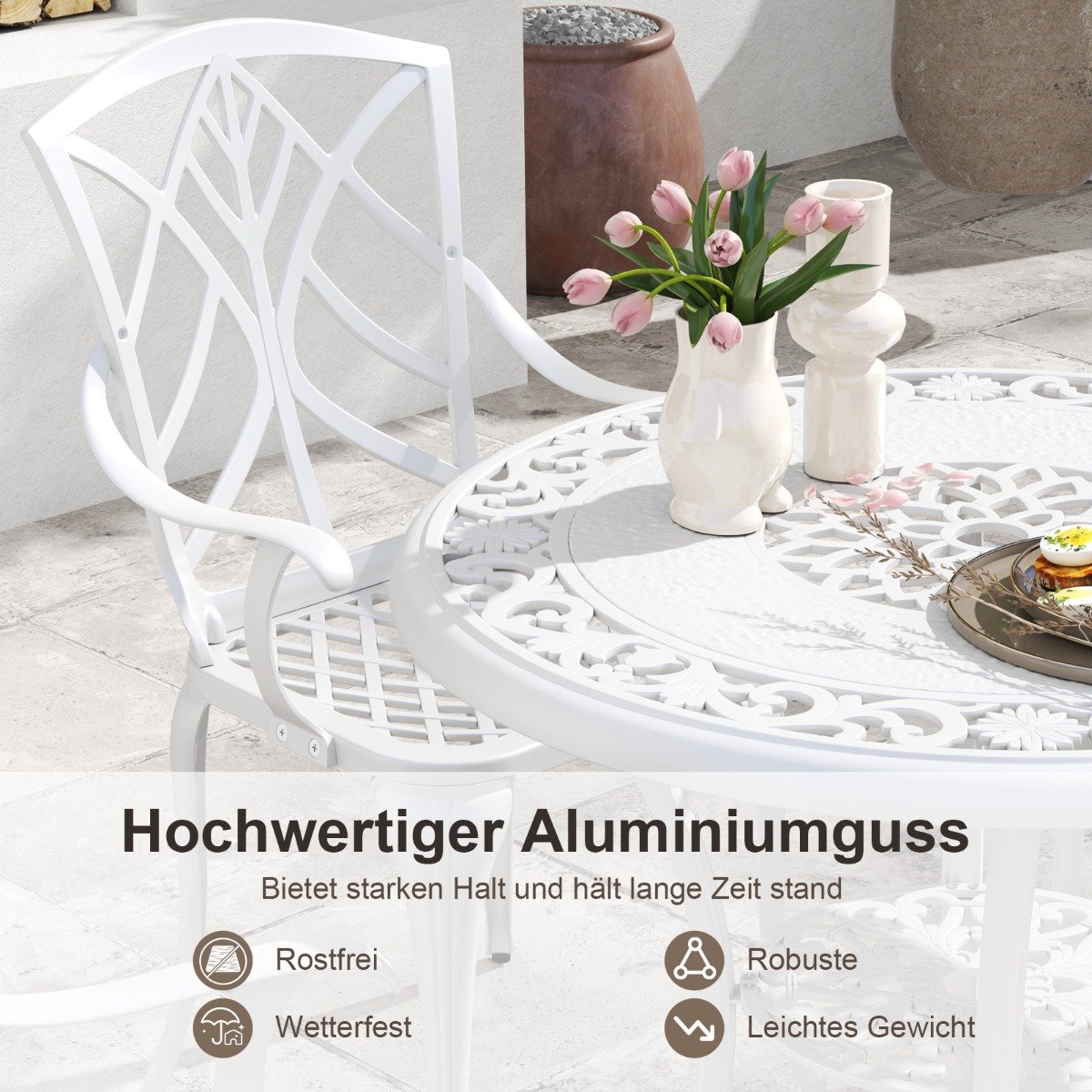 Atnaujinkite savo lauko maisto gaminimo patirtį su šiuo aukštos kokybės aliuminio ketaus bistro komplektu. Jis puikiai tiks jūsų sode, verandoje ar balkone, suteikdamas elegancijos ir jaukumo.