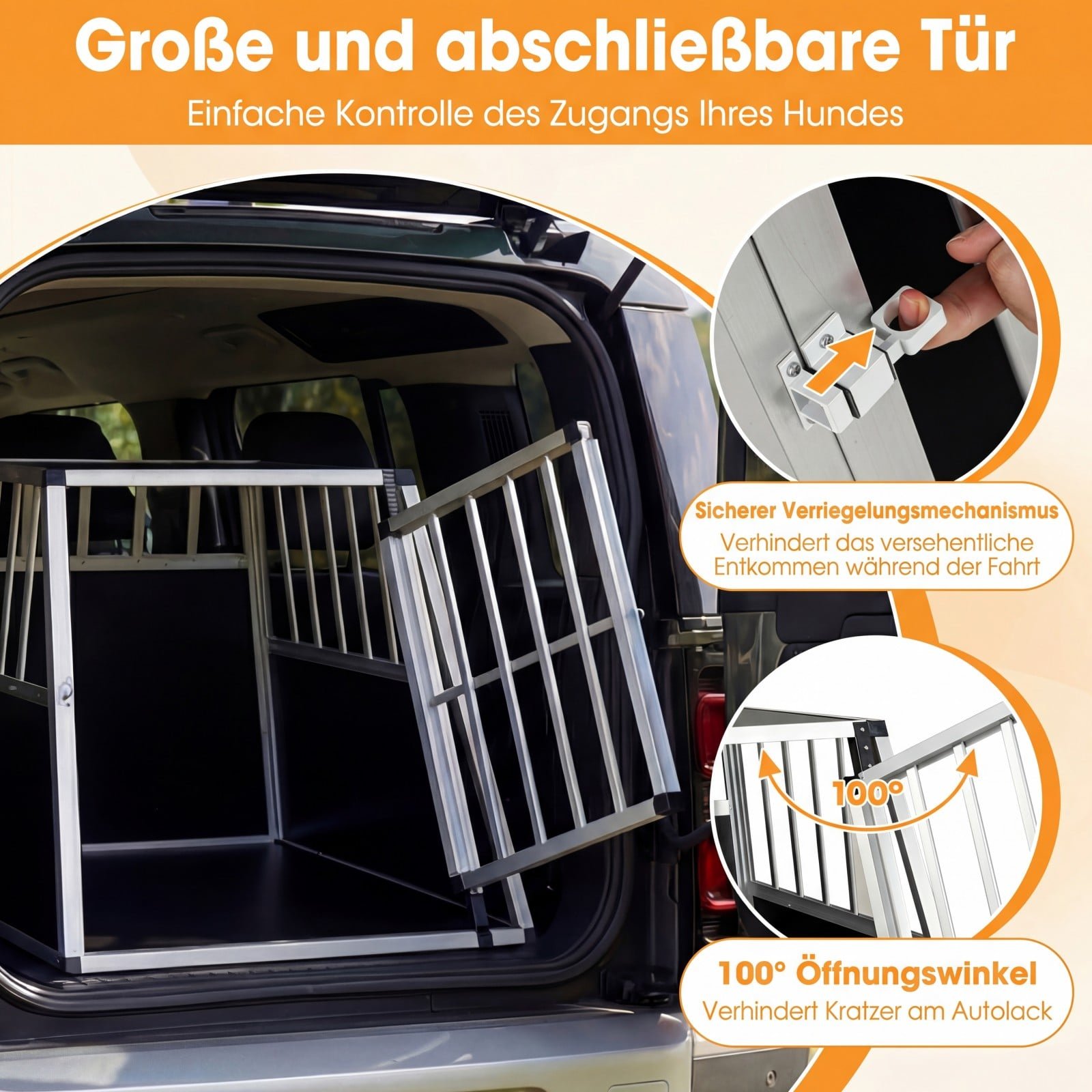 - Saugios užrakinamos durelės: Narvas turi patikimą užrakto sistemą, kuri užtikrina, kad jūsų augintinis kelionės metu visada būtų saugus. 100° atsidarymo kampas leidžia lengvai ir greitai įkelti ar iškelti gyvūną, nerizikuojant subraižyti automobilio dažų.