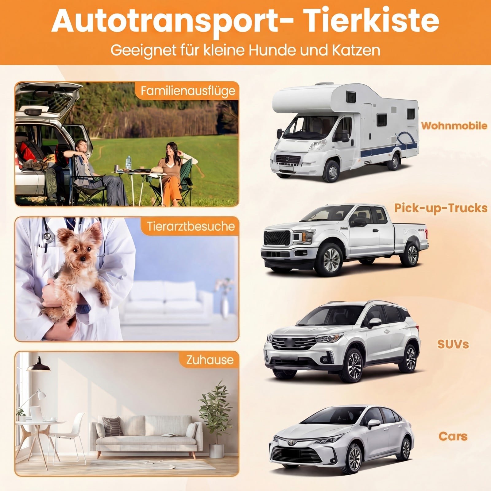 - Universalus pritaikymas: Šis kompaktiškos trapecinės konstrukcijos transportavimo narvas lengvai telpa į beveik bet kurį automobilį, sunkvežimį ar visureigį, palengvindamas jūsų augintinio mobilumą visose kelionėse.