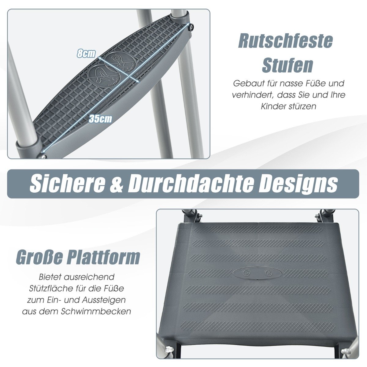 - Plati, neslystanti platforma ir pakopos didina saugumą, net ir šlapiomis kojomis.