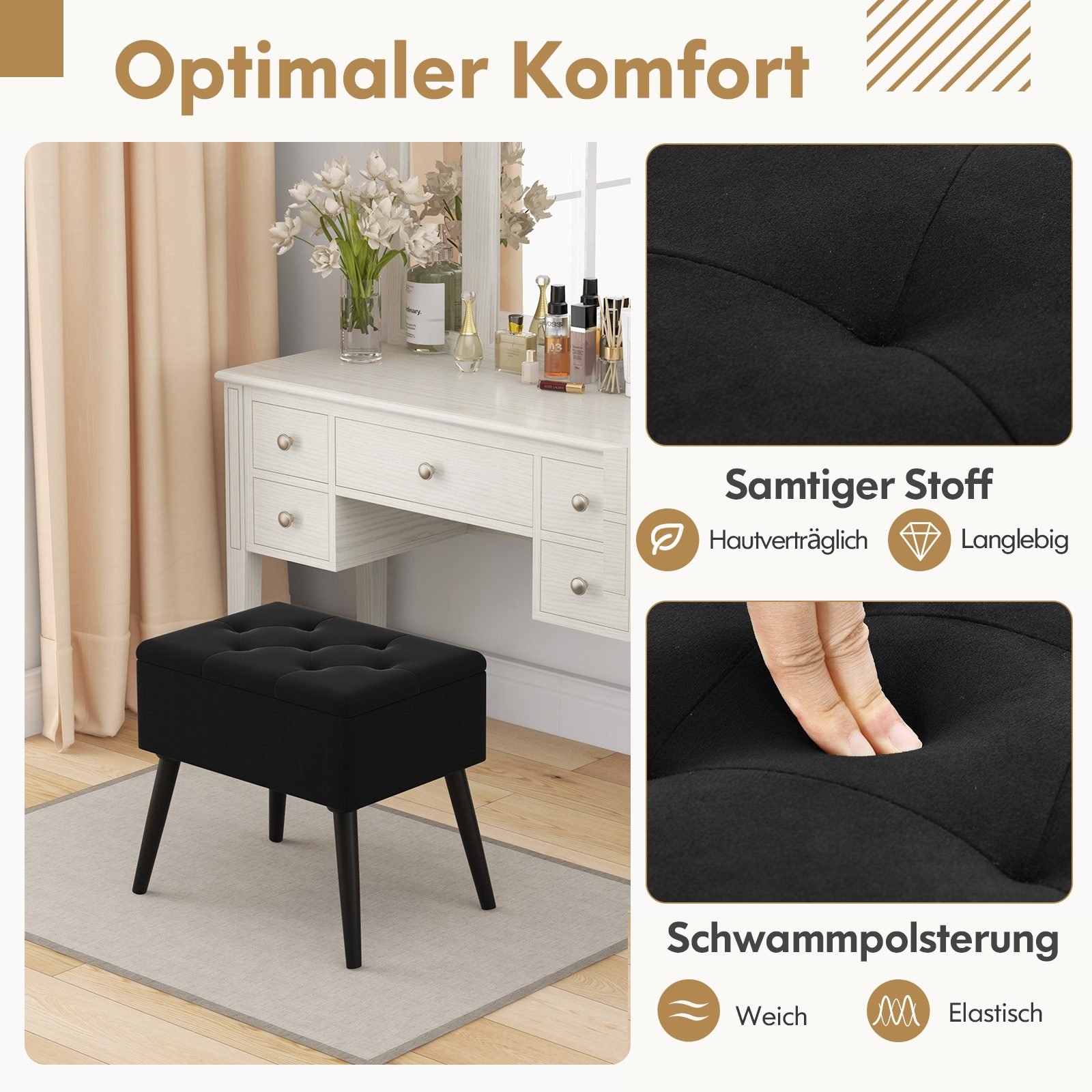 - Medžiaga: Aksamitas, kempinė, medžio masyvas, MDF, metalas