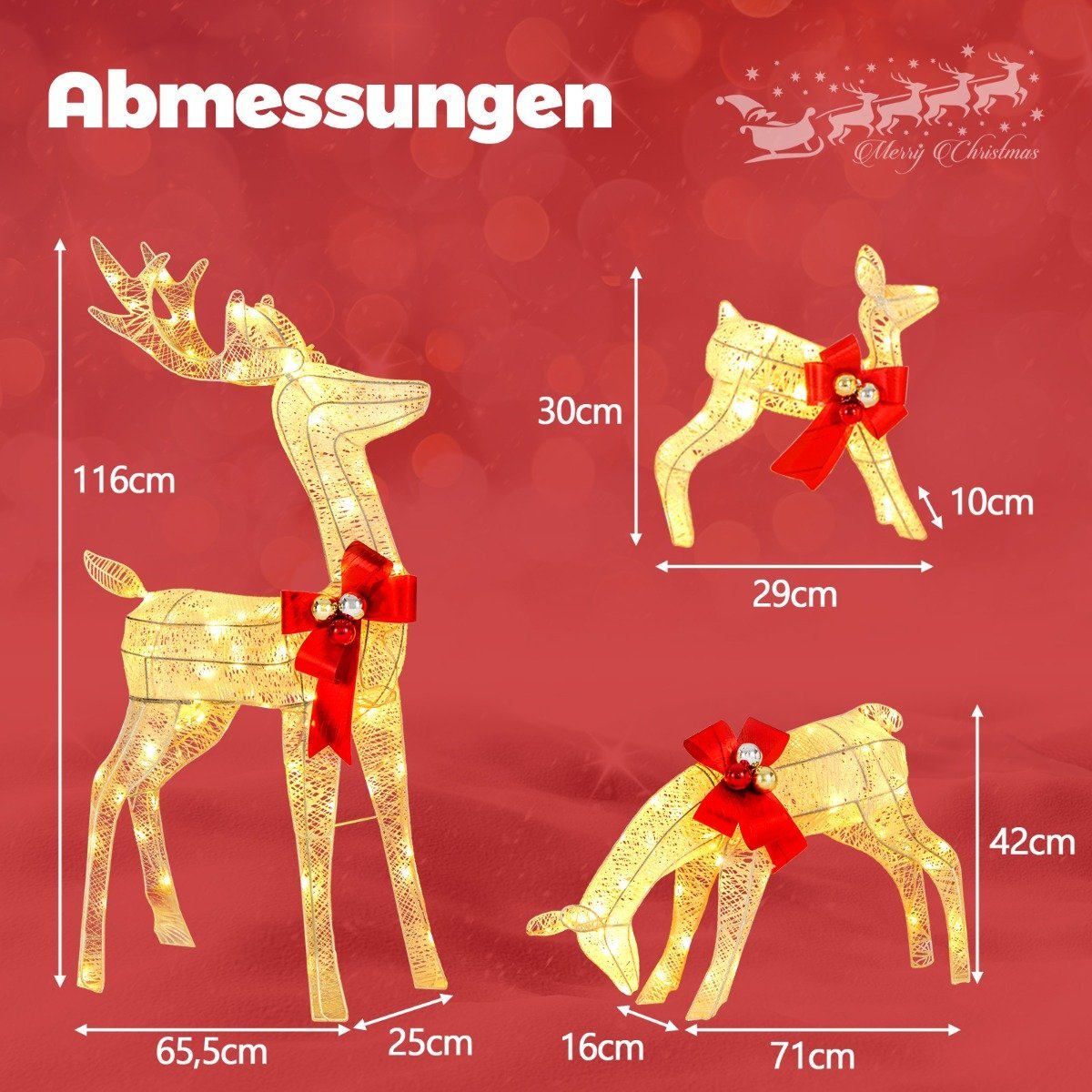 Sukurkite nepakartojamą šventinę nuotaiką su šia LED apšviesta elnių šeima! Komplekte yra trys skirtingo dydžio elniai, kurie jūsų namams ar sodui suteiks ypatingo žavesio švenčių metu.