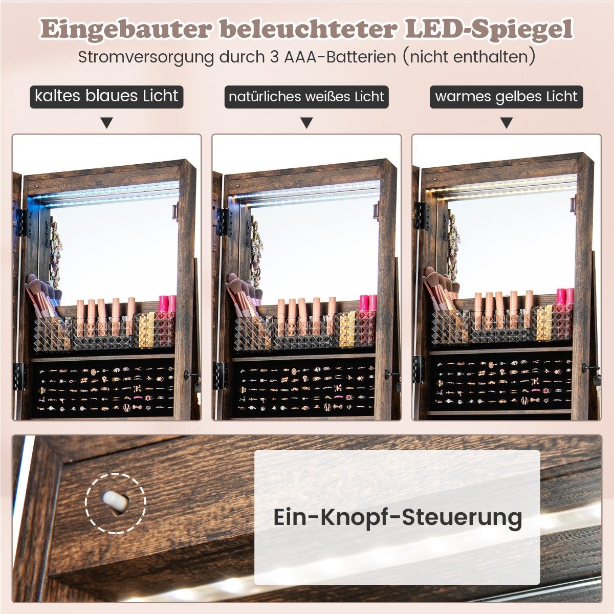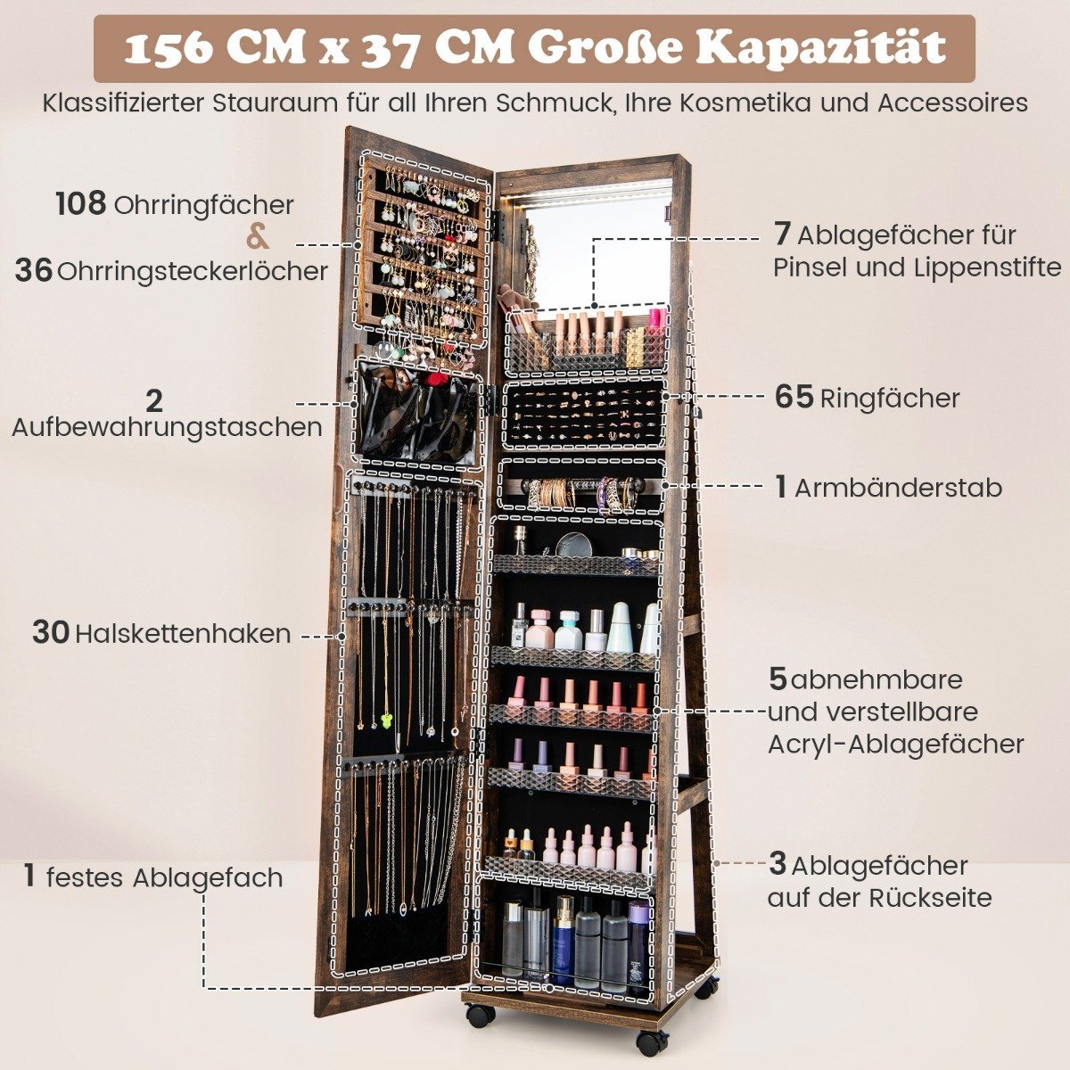 Savo papuošalų kolekciją tvarkingai laikykite šioje stilingoje papuošalų spintelėje. Su daugybe skyrių, kabliukų ir lentynų ji suteikia pakankamai vietos visiems jūsų karoliams, auskarams, žiedams ir kitiems aksesuarams. Integruotas veidrodis ne tik leis pasitikrinti savo įvaizdį, bet ir suteiks jūsų kambariui elegancijos.