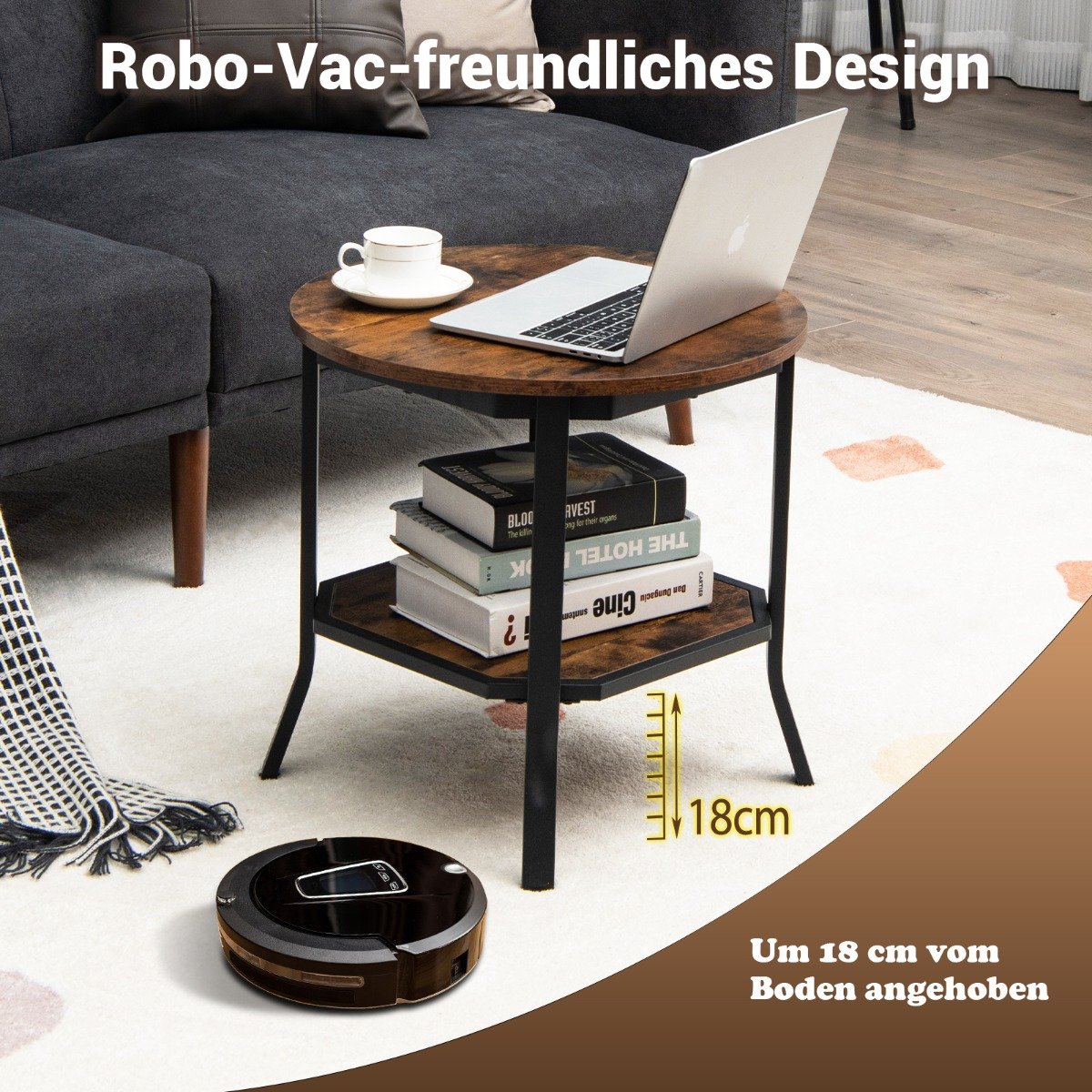 Apvalus dviejų pakopų staliukas su atviru skyriumi ir plieninėmis kojomis (Ruda)