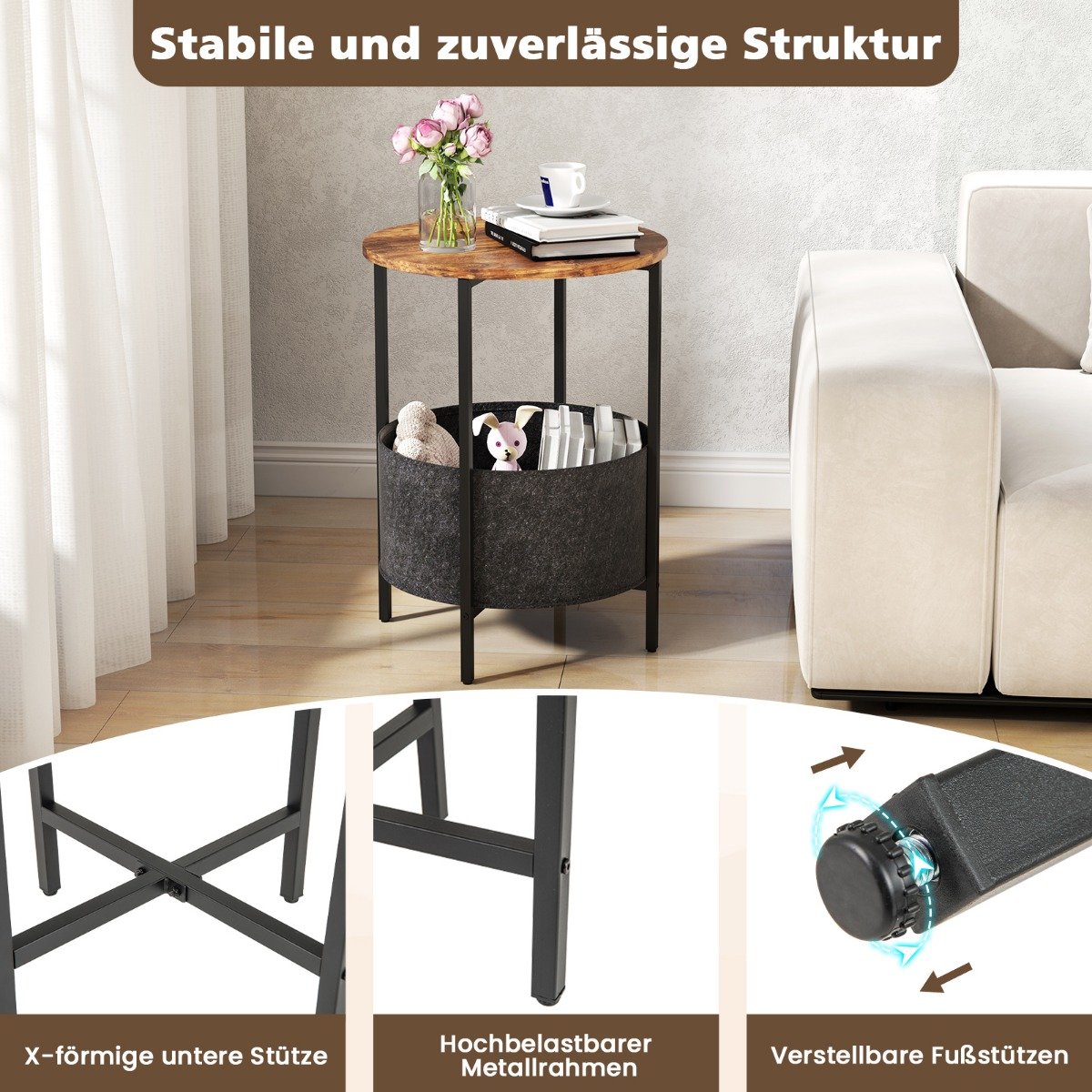 Šis daugiafunkcis apvalus staliukas suteiks jūsų namams stiliaus ir praktiškumo. Jo erdvi stalviršis ir nuimamas krepšys leis patogiai laikyti daiktus, o tvirta konstrukcija užtikrina stabilumą.