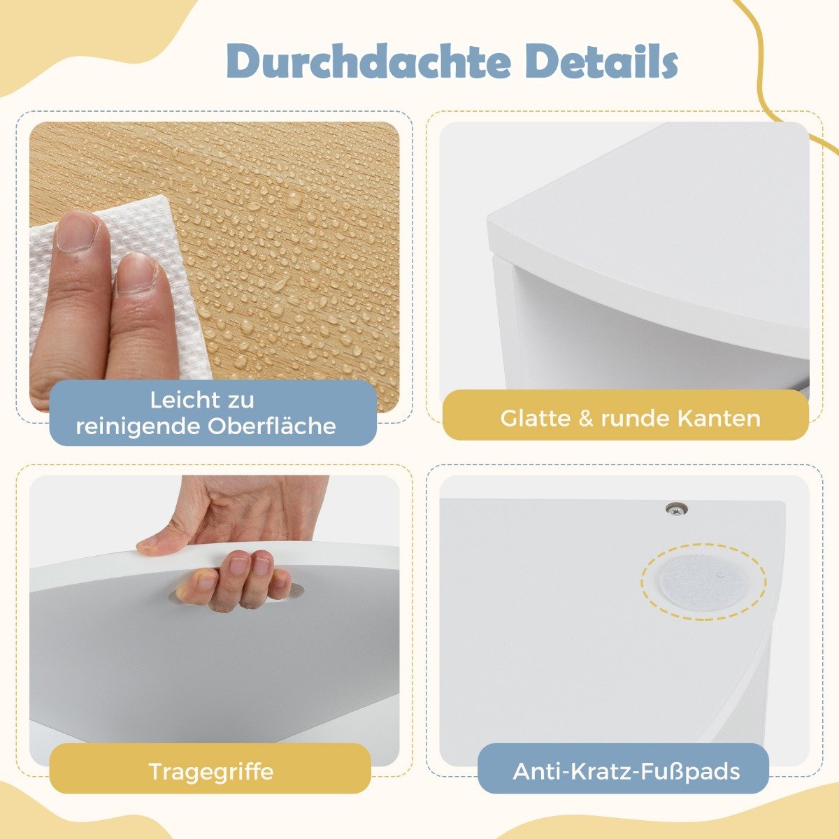 - Saugi konstrukcija: pagaminta iš tvirtos MDF medžiagos, suapvalintais kampais ir apsauginiais padėklais.