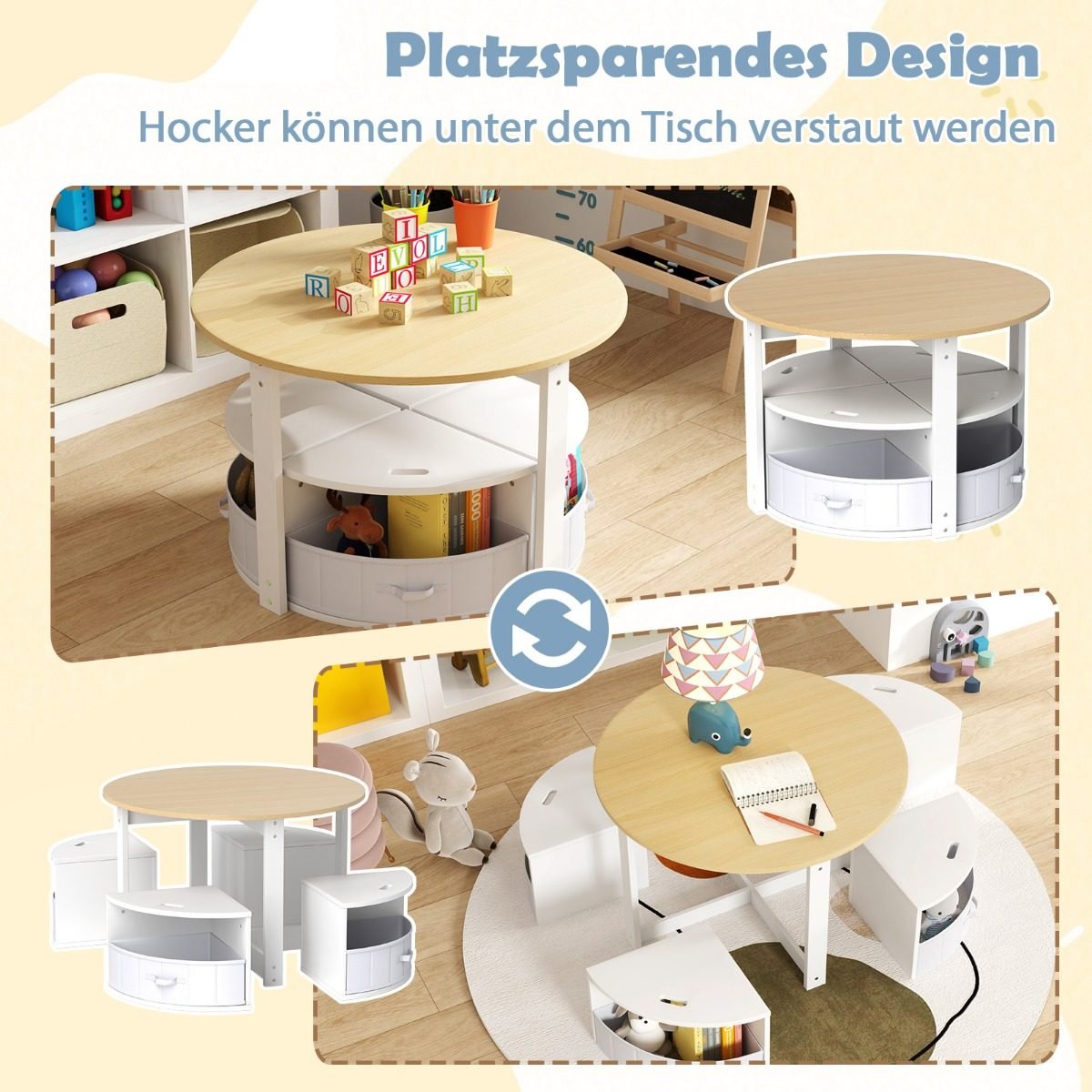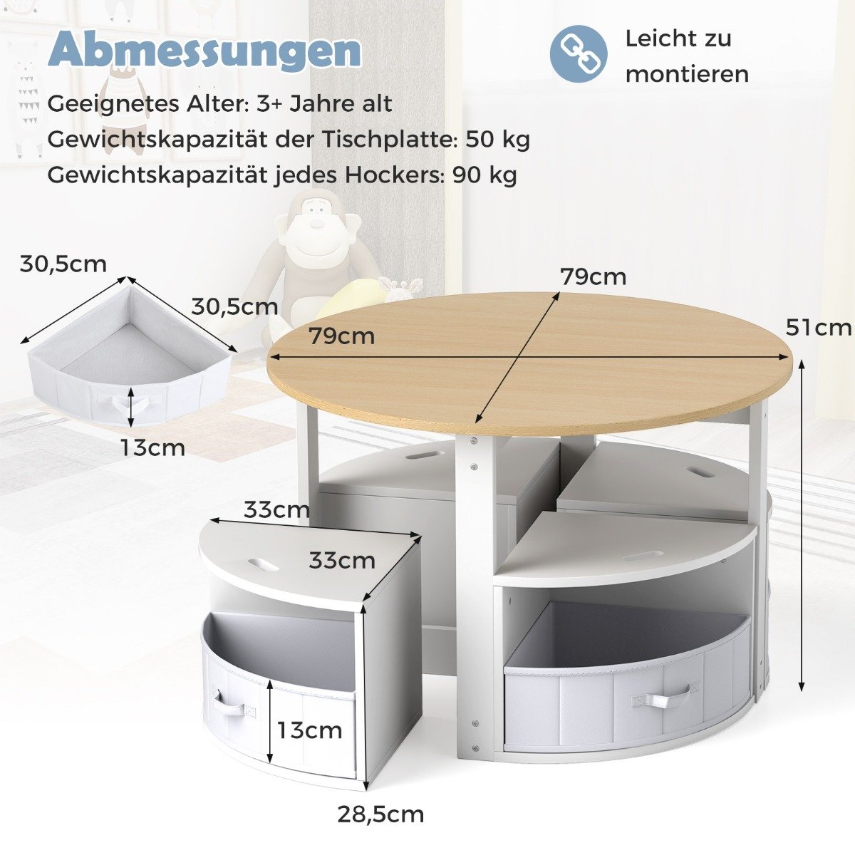 Apvalus vaikiškas stalas su keturiomis kėdutėmis ir daiktadėžėmis (Natūrali)