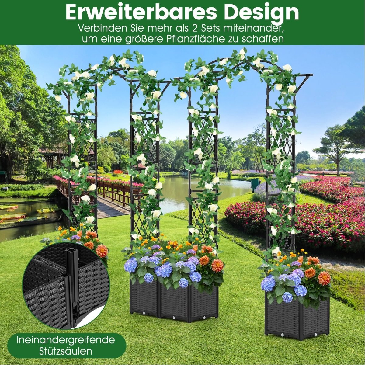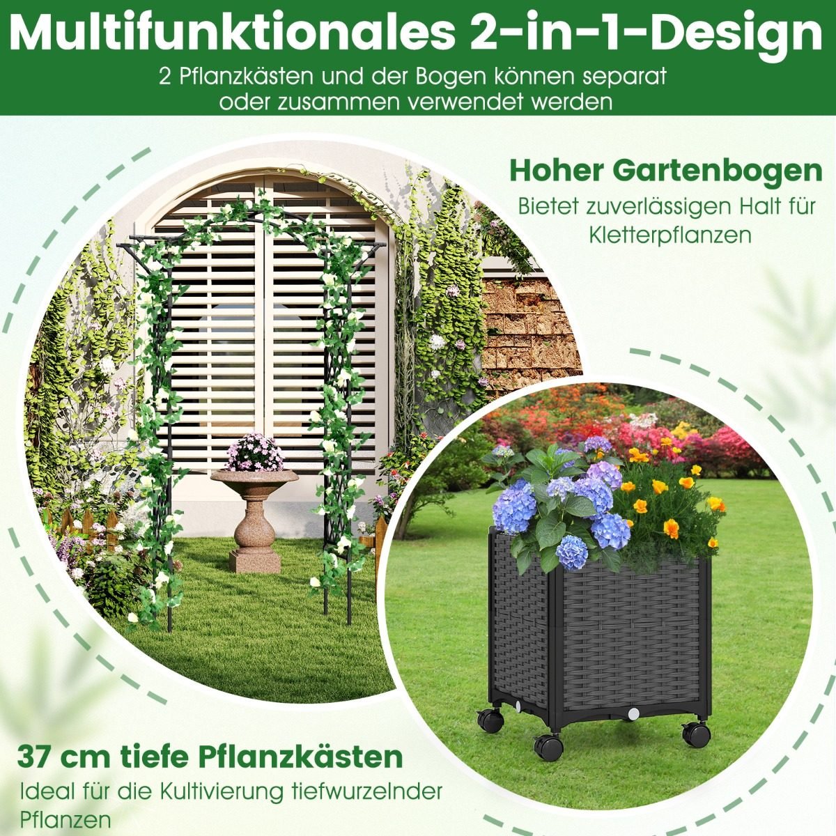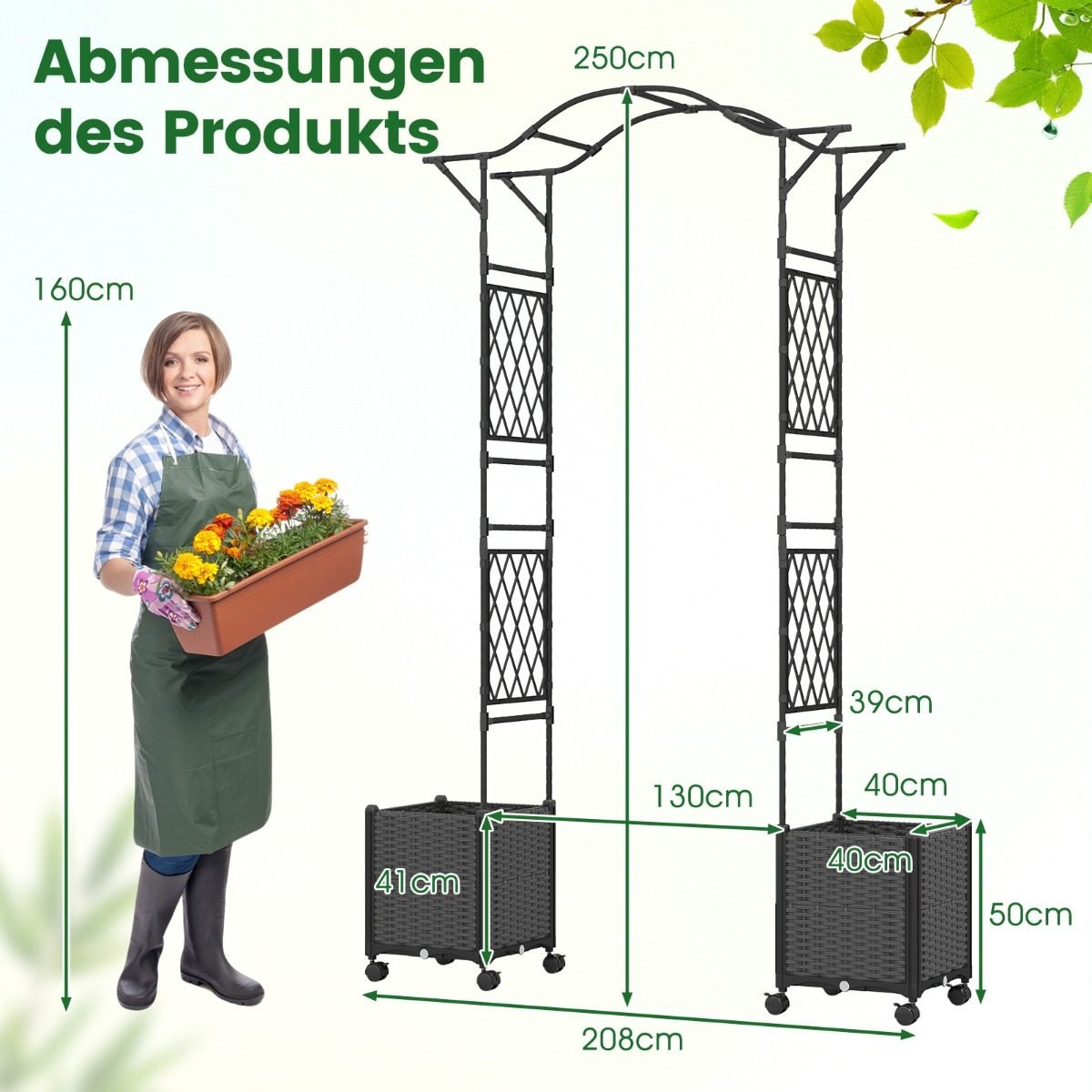 Suteikite savo sodui naują išraišką su šia universalia arkiniu gėlių atrama. Tai 2-in-1 sprendimas, apjungiantis gėlių atramą ir du integruotus, savaime laistymo vazonus, kurie palengvins augalų priežiūrą ir užtikrins optimalų drėkinimą.