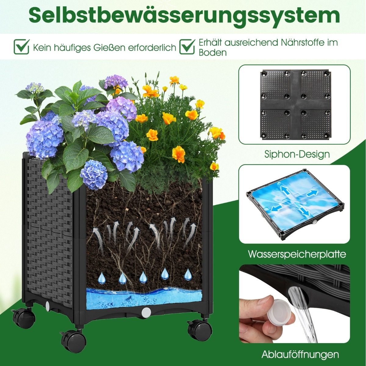 - Erdvūs vazonai: 37 cm gylis leidžia auginti ir giliai įsišaknijančius augalus.