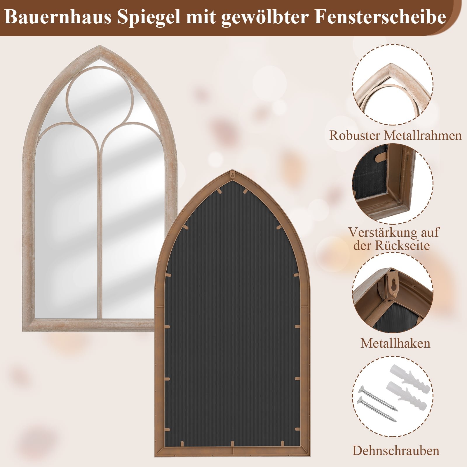 Suteikite savo namams išskirtinumo su šiuo kaimiško stiliaus langinio rėmo veidrodžiu. Šis didelis, arkinis sieninis veidrodis pasižymi tvirtu metaliniu rėmu, garantuojančiu ilgaamžiškumą ir stilių. Jis ne tik atspindi šviesą ir vizualiai padidina erdvę, bet ir užtikrina saugumą, nes stiklas yra apsaugotas nuo dūžio.