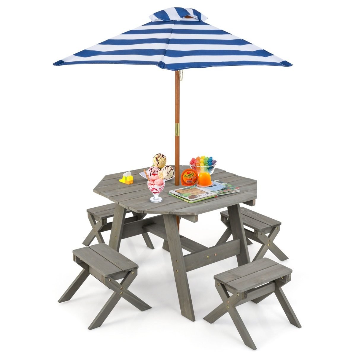 Aštuonkampis medinis pikniko stalo ir kėdžių komplektas su skėčiu (Pilka)