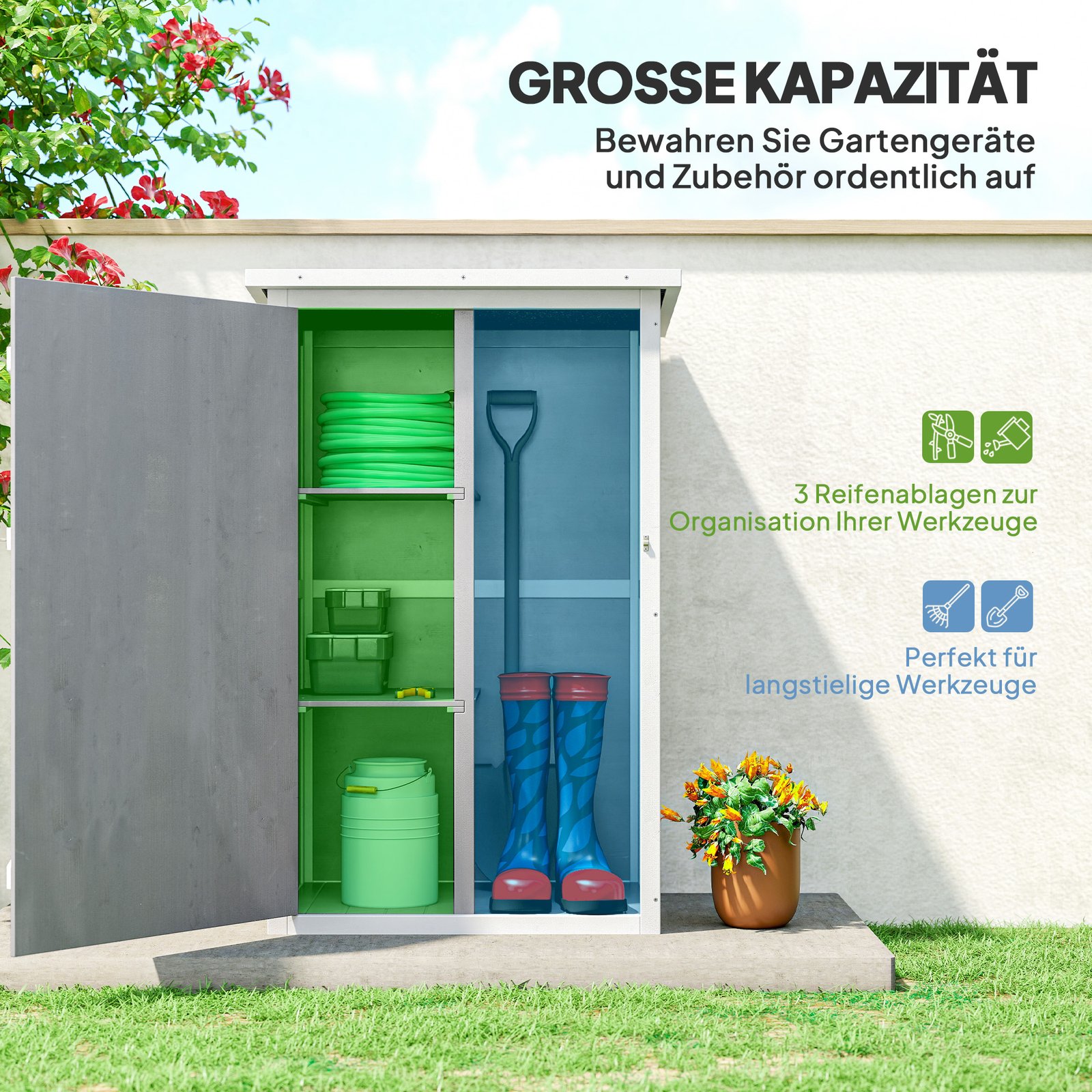 ✔ Kompaktiškas įrankių spintos dizainas puikiai tinka mažesnėms lauko erdvėms