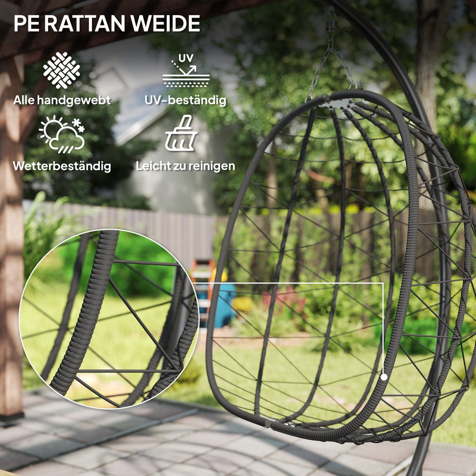 Atsparus oro sąlygoms kabantis kiaušinio formos lauko krėslas su patogia pagalvėle