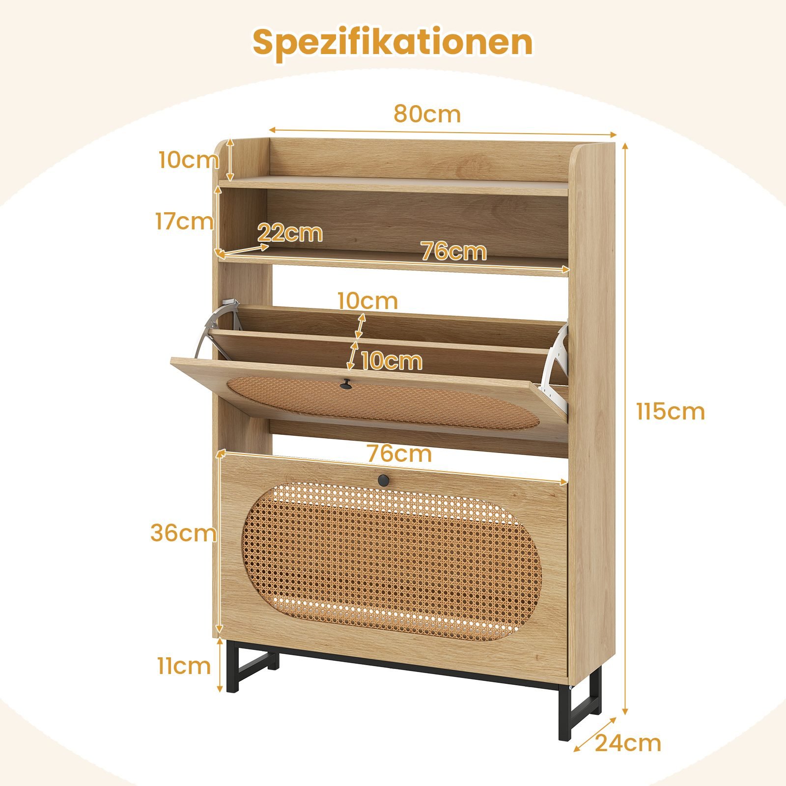 Aukšta batų spintelė su 2 stalčiais ir natūralaus rotango durelėmis (Natūrali)