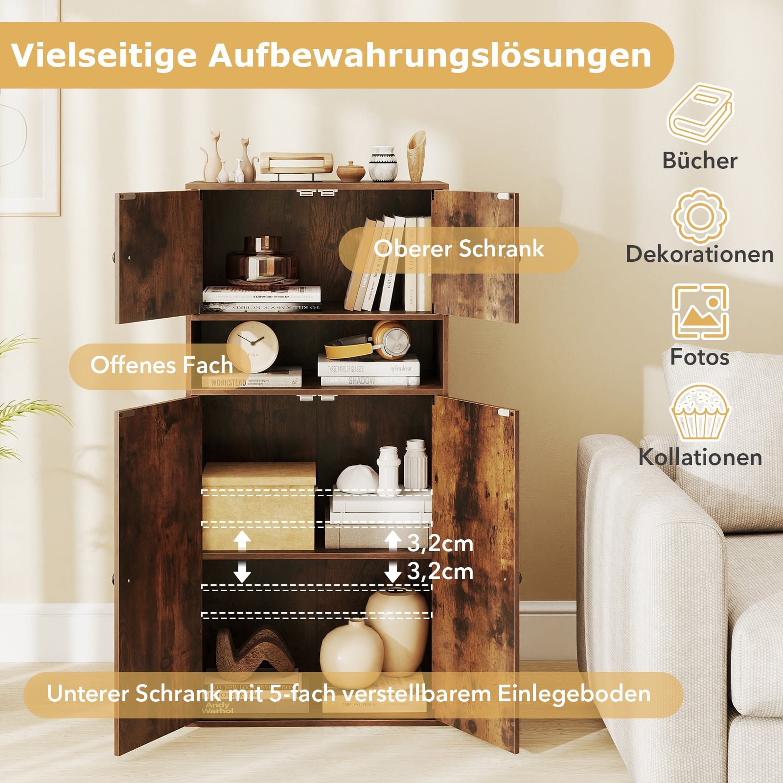 Ši universali spinta – puikus sprendimas norintiems stilingai ir efektyviai išnaudoti namų erdvę. Reguliuojamos vidinės lentynos ir atviros lentynos leidžia jai lengvai prisitaikyti prie jūsų poreikių – nuo dekoracijų eksponavimo iki didesnių daiktų saugojimo už elegantiškų durelių su magnetiniais užraktais. Dėl modernaus silueto ir klasikinės apdailos, spinta lengvai įsilies į bet kurį kambarį, o kompaktiškas, tačiau erdvus dizainas tinka svetainėms, miegamiesiems ar namų biurams, kuriuose svarbu funkcionalumas ir stilius.
