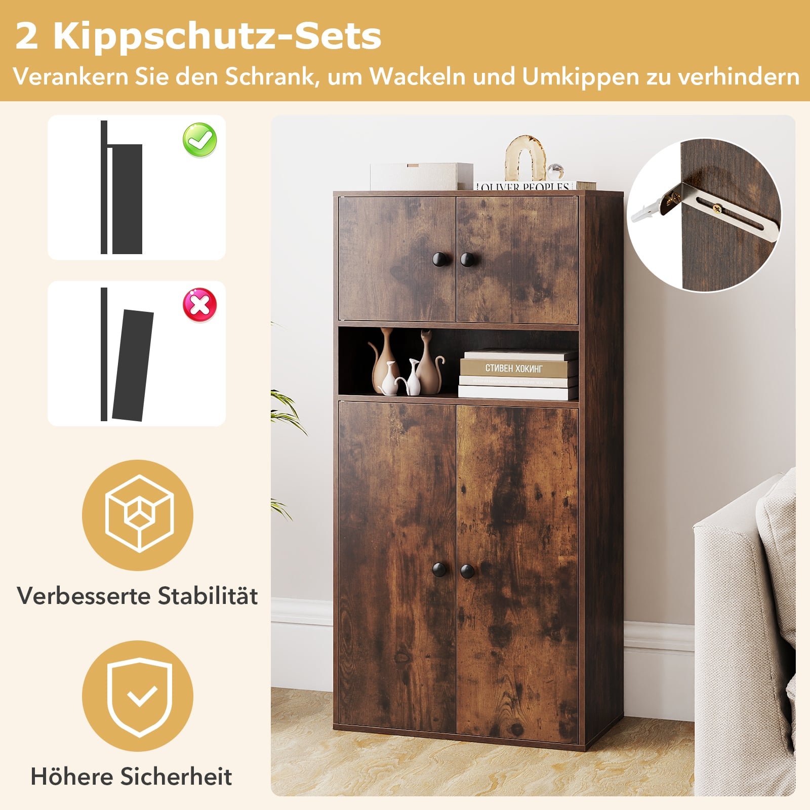 Aukšta knygų spinta su 4 durimis ir reguliuojama lentyna (Rustikinė ruda)