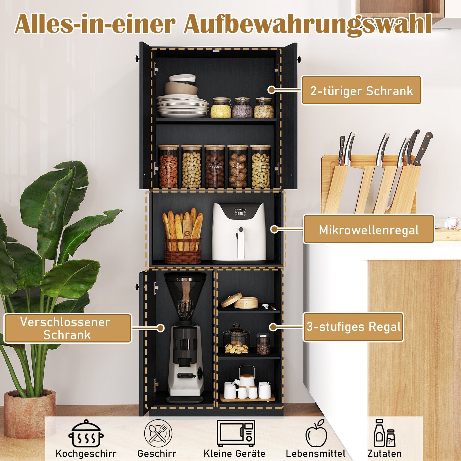 Atsisveikinkite su netvarkingais virtuvės stalviršiais! Ši elegantiška, 166 cm aukščio daugiafunkcinė spintelė ne tik siūlo gausybę vietos daiktams – su mikrobangų krosnelės lentyna, dvidurėmis ir viendurėmis spintelėmis bei trimis atviromis lentynomis – bet ir užtikrina nepriekaištingą virtuvės tvarką. Jos stabilumas ir vandeniui atsparus paviršius garantuoja ilgaamžiškumą bei lengvą priežiūrą.