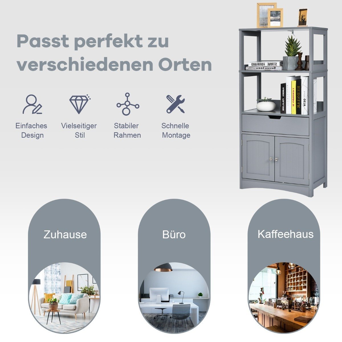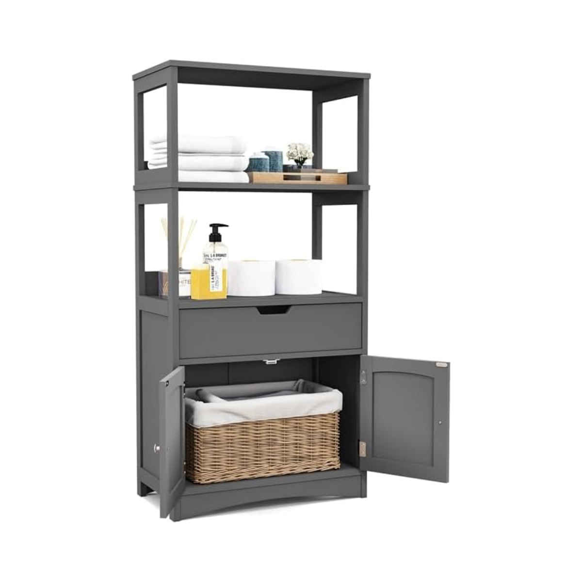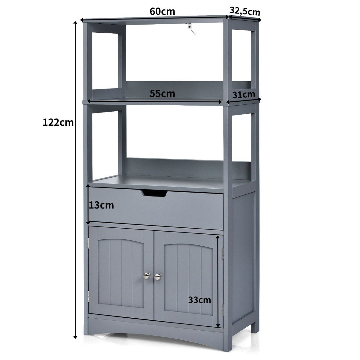 Aukšta vonios spintelė su 2 durelėmis ir atviromis lentynomis (Pilka)