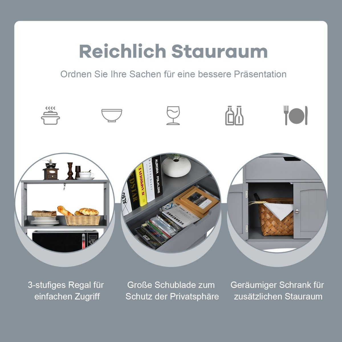 - Suteikia daug vietos daiktams laikyti dėl atvirų lentynų ir stalčiaus.