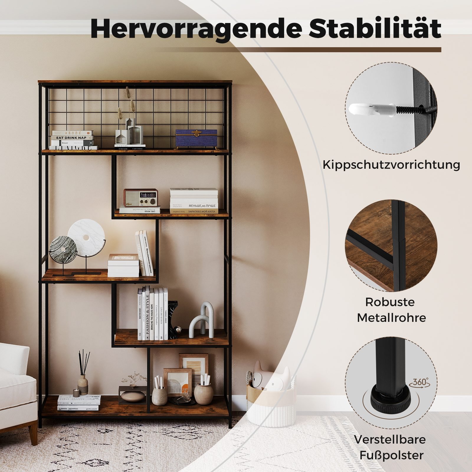 Padidinkite savo namų erdvę su šiuo stilingu ir funkcionaliu 6 pakopų lentynų stoveliu. Tvirtas metalinis dizainas ir geometrinės formos suteiks modernumo bet kuriam Jūsų kambariui.