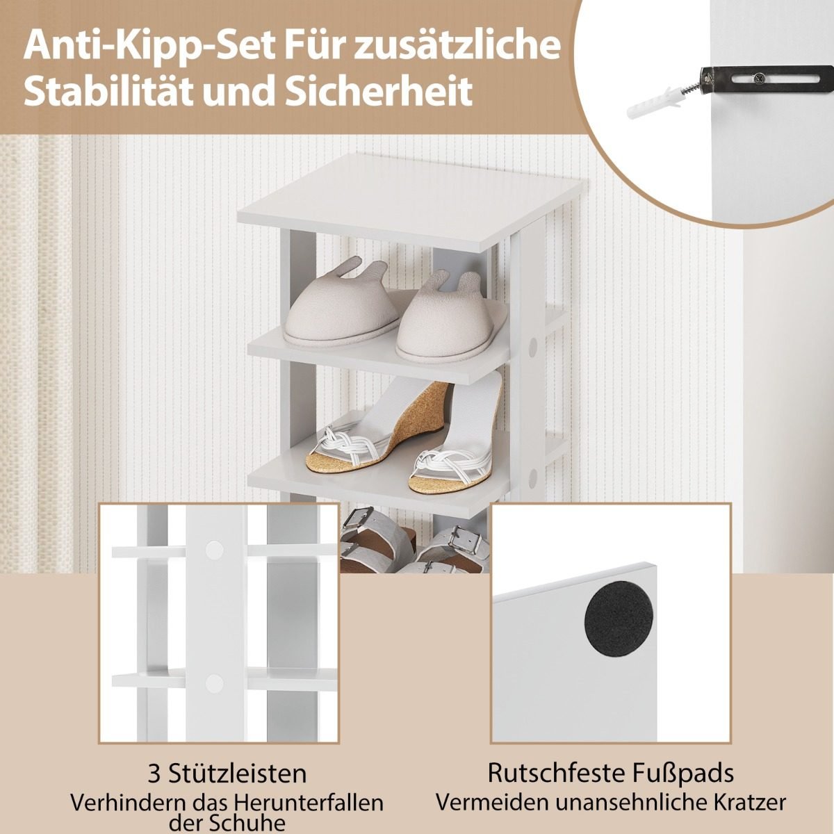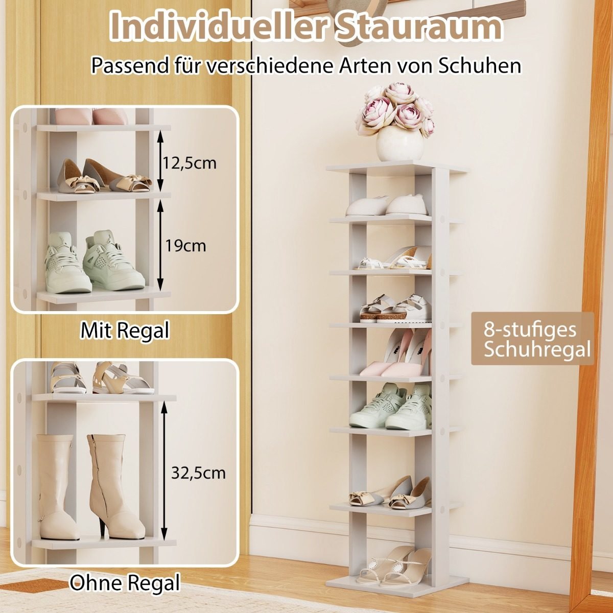 - 7 pakopų dizainas su skirtingais tarpais tarp lentynų leidžia patogiai rūšiuoti įvairių tipų avalynę.